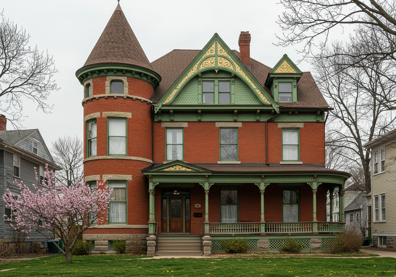 They often feature cylindrical turrets or roof towers, and feature intricately designed woodwork such as adorning finials, window crowns and scalloped shingles which draw passing eyes towards the distinctive gables.