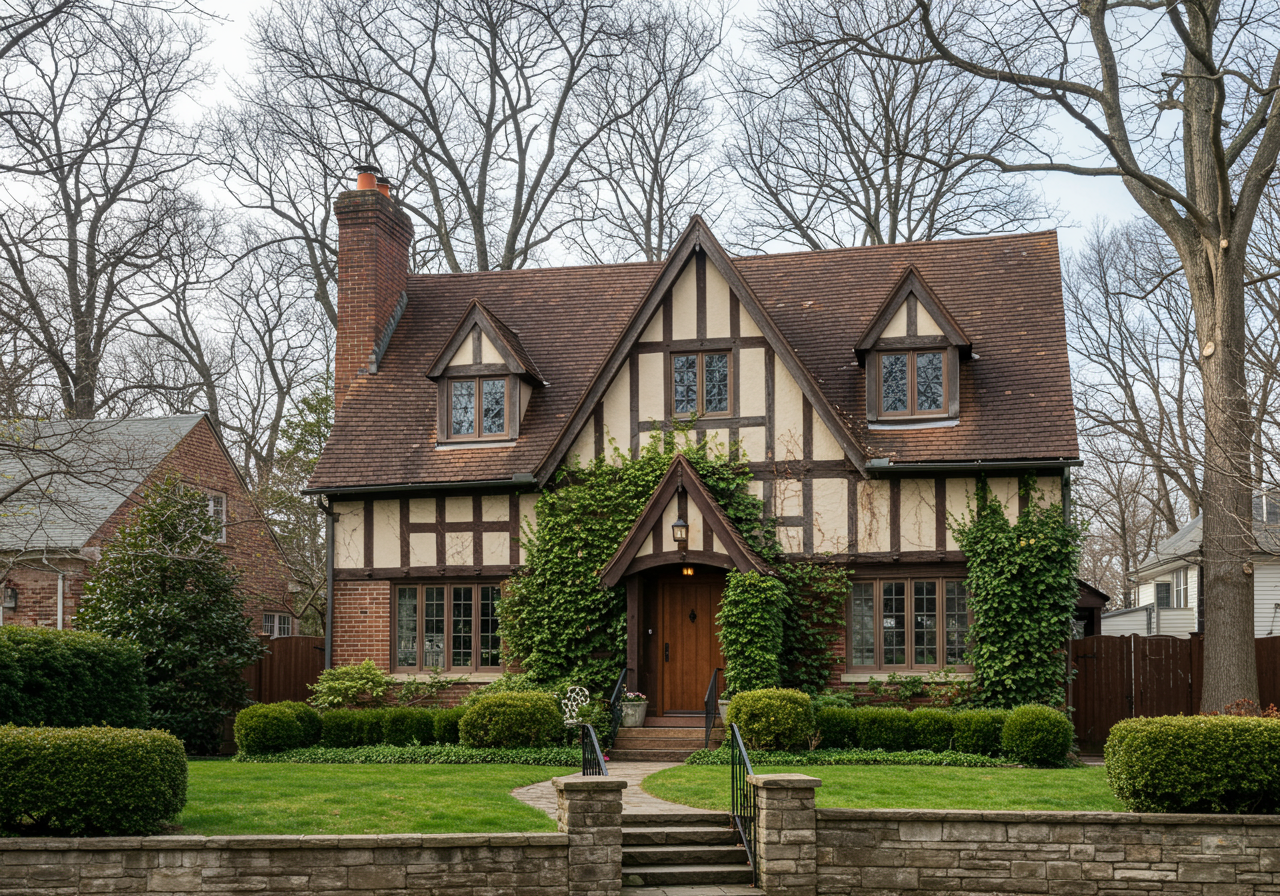 Tudor – The Tudor is very distinctive, thanks to the folk-tale-like decorative wood—known as half-timbering—which covers brick, stucco, or stone siding typical of this style.