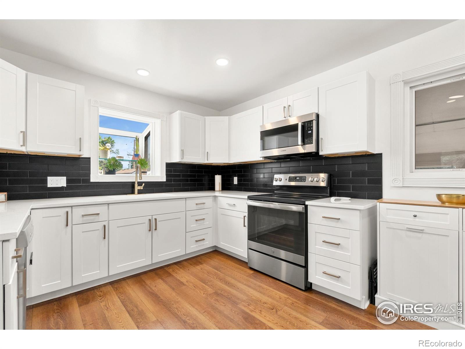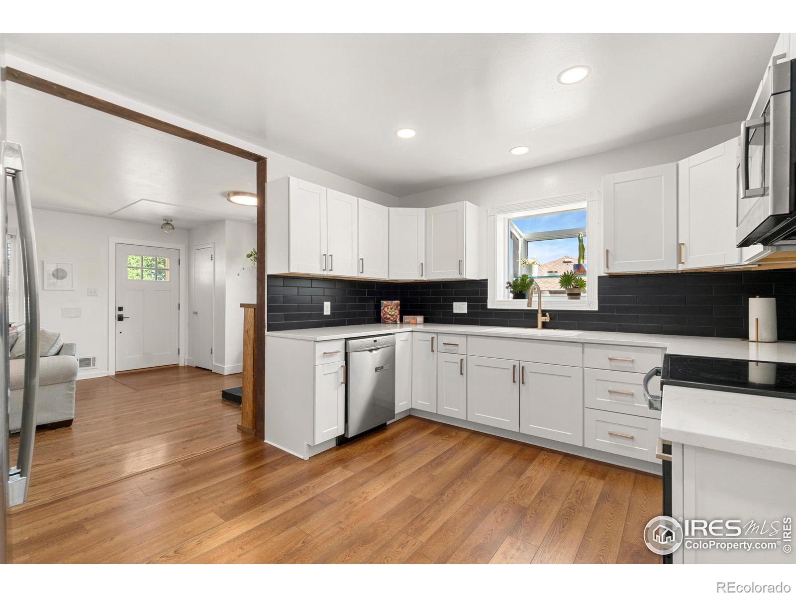Welcome to this updated Ranch-style home in the heart of Northglenn! Thoughtfully updated, well maintained, and full of charm. This spacious 5-bedroom, 2-bathroom property sits on a large lot with an oversized 2-car garage, shed, extended driveway, and gated RV parking. Step inside to discover a modern kitchen, updated bathrooms, and designer touches throughout. Some of the recent exterior updates are newer vinyl windows, newer roof, siding and wood accents. Inside you'll find hardwood floors, wood burning stove, new appliances, new cabinets, and quartz countertops. With almost 300 sq ft, the finished sunroom offers an adorable dining area as well as an office space. Expansive back deck, mature landscaping and fully fenced yard are ideal for entertaining. Convenient central location with easy access to I-25, nearby parks, pool, shopping, and dining. Assumable 2.875% FHA loan.