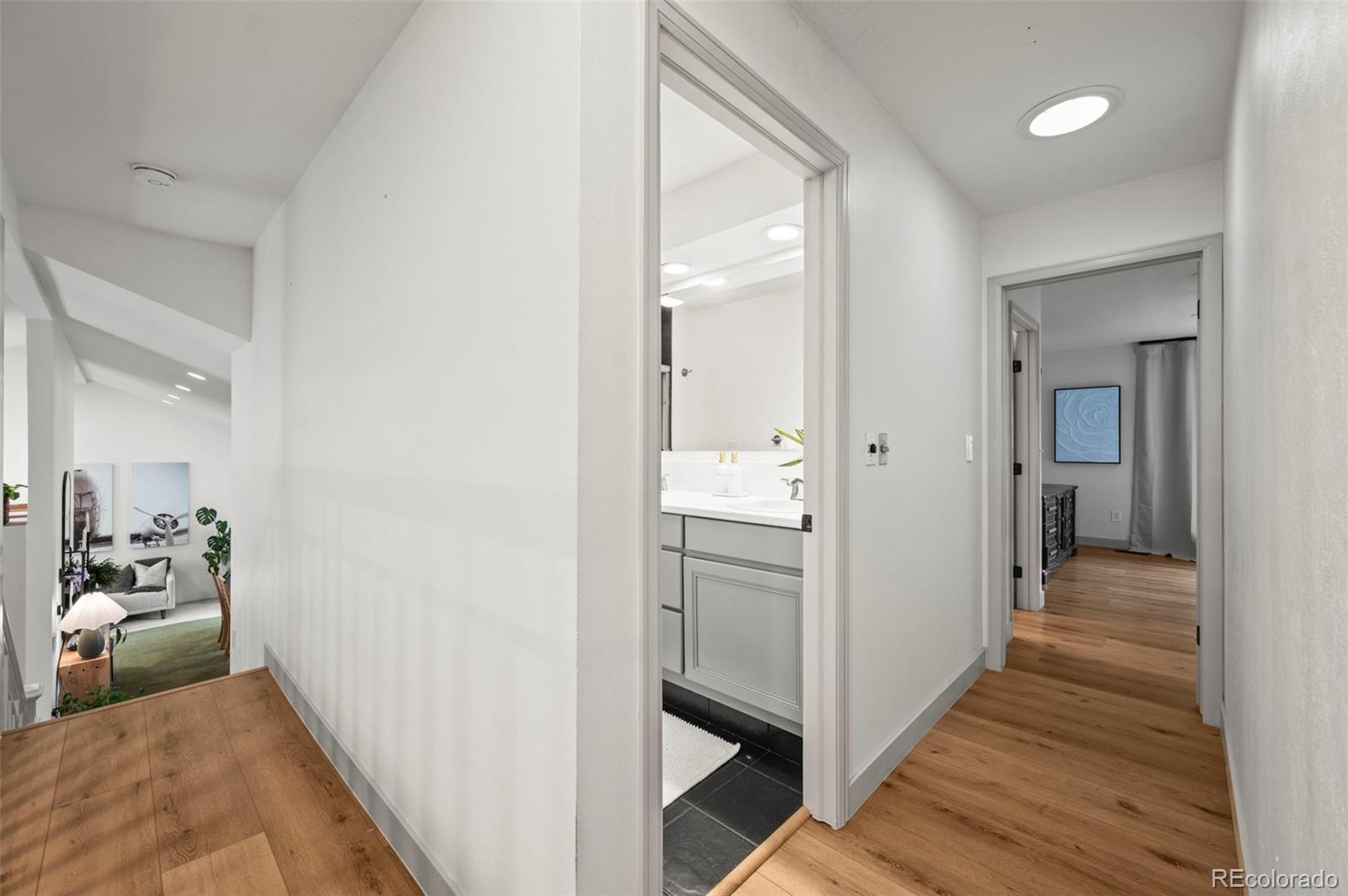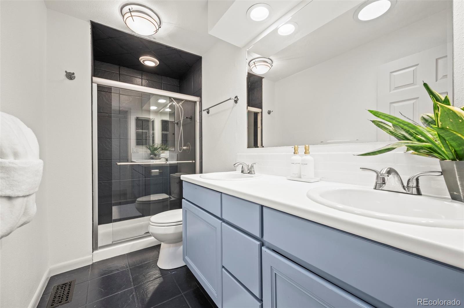 The primary suite is generously sized, featuring a spa-inspired bathroom with a luxury shower complete with body sprays and hand wand, double vanity with lighted mirrors, and a large custom closet with built-ins . A secondary bedroom with a full hall bath completes this level, with new flooring continuing throughout this level.