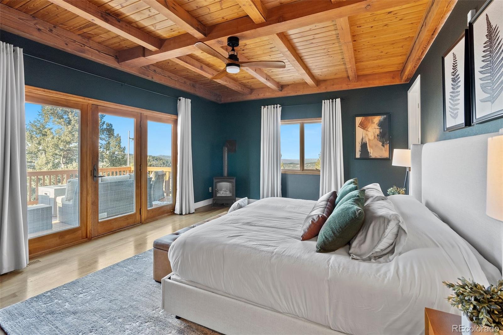 The main-floor primary suite is a true retreat, complete with French doors opening to a spacious deck, a spa-inspired bathroom with soaking tub, walk-in shower, dual vanities, and a large custom closet. A dramatic floor-to-ceiling stone fireplace anchors the great room, creating a warm and inviting gathering space. Also on the main level: a second bedroom, half bath, and a functional laundry room for added convenience.