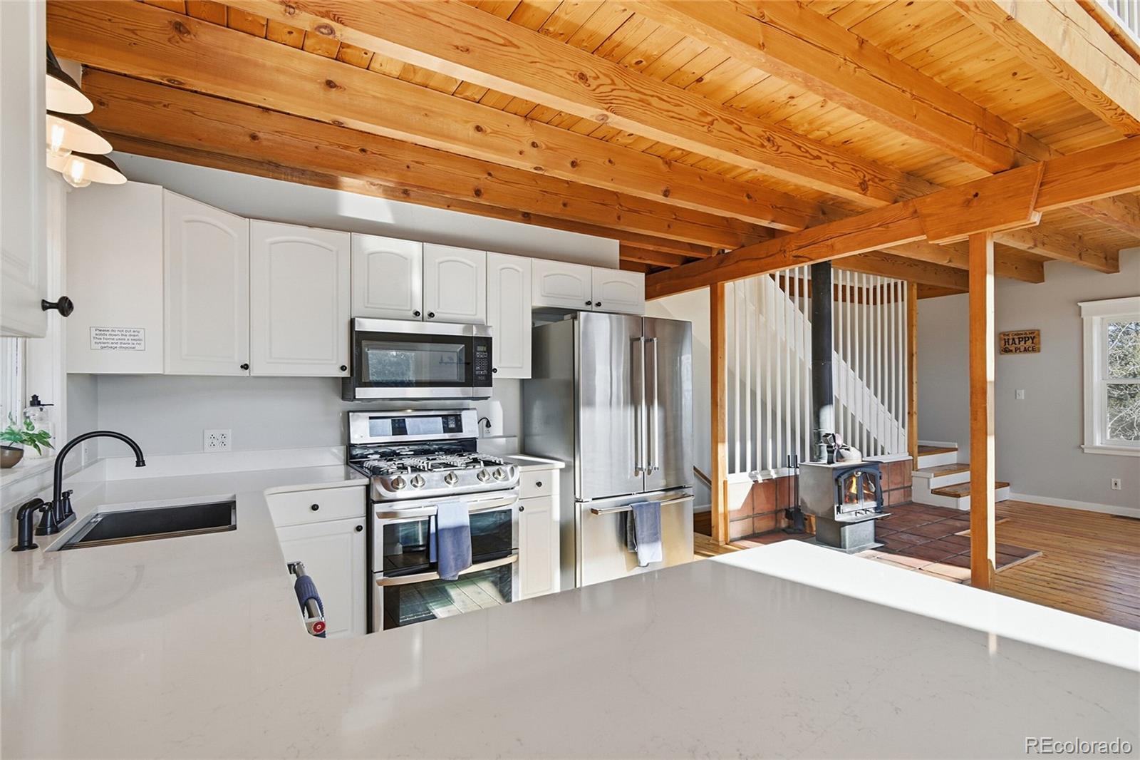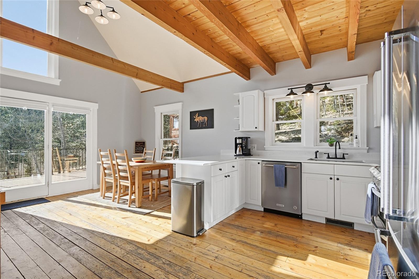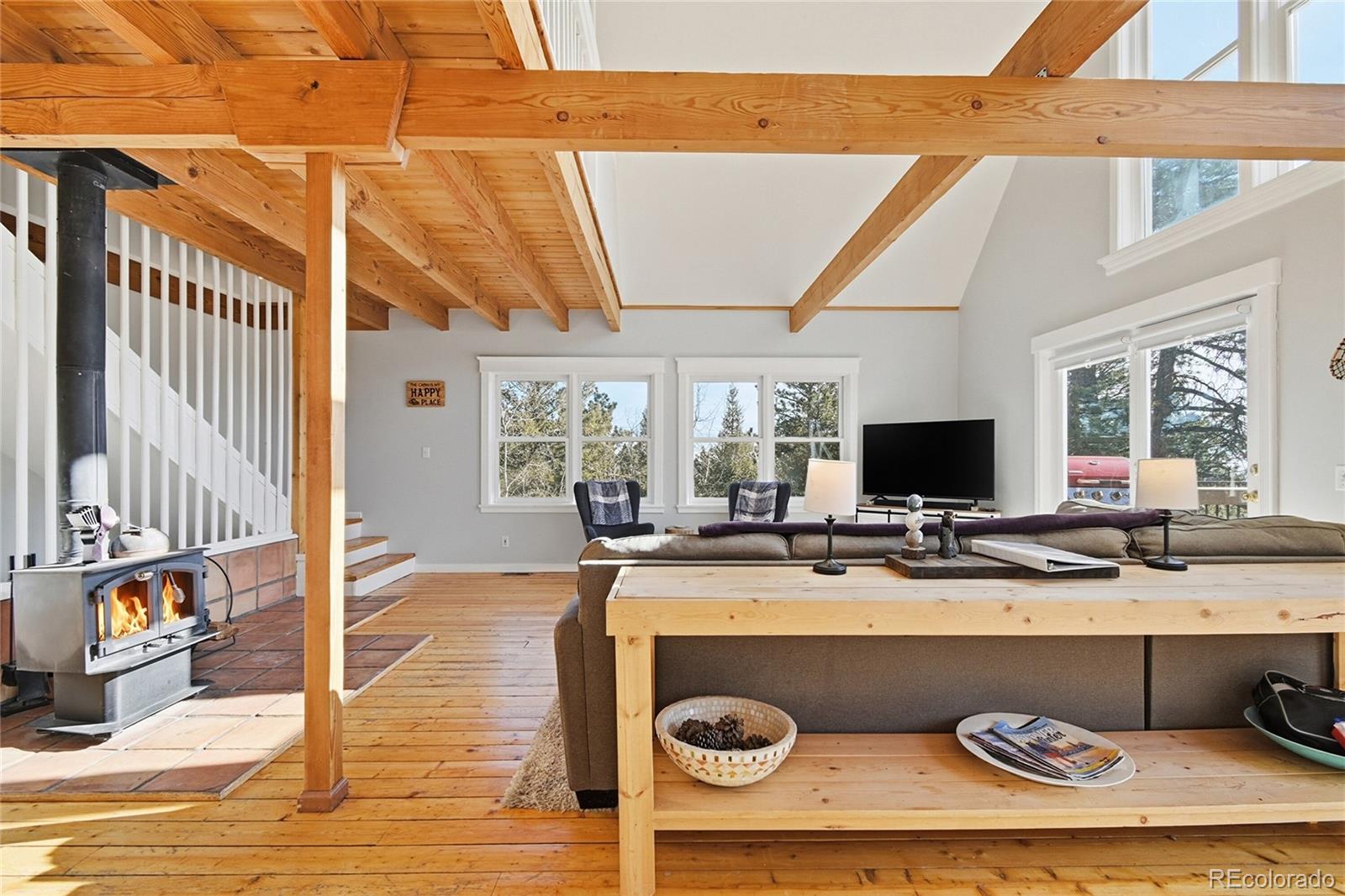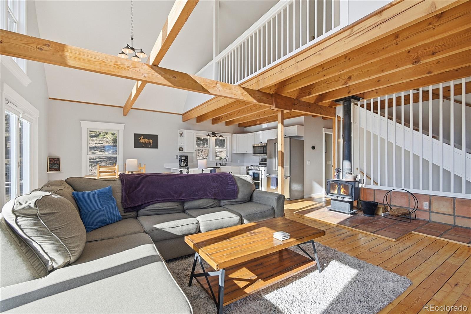 This open, sun-drenched chalet-style A-frame welcomes you with soaring ceilings, exposed beams, and gorgeous spruce pine and oak flooring that add warmth and character throughout. The kitchen is equipped with newer KitchenAid appliances, including a gas range, and new quartz counters making it perfect for everyday living or hosting friends after a day in the mountains. Natural gas heat and a cozy wood-burning gas stove keep the home comfortable year-round.