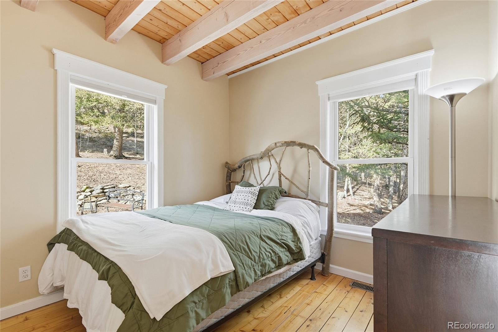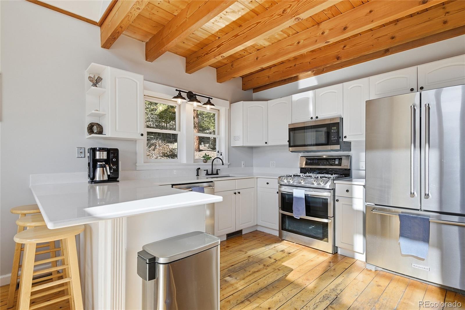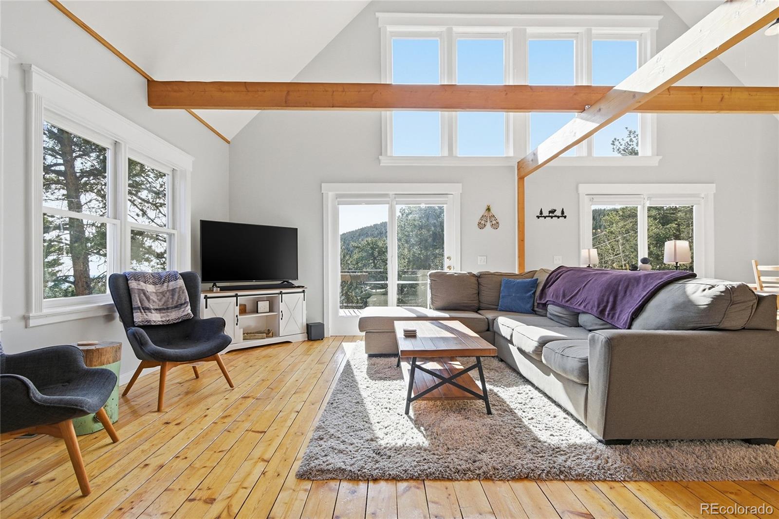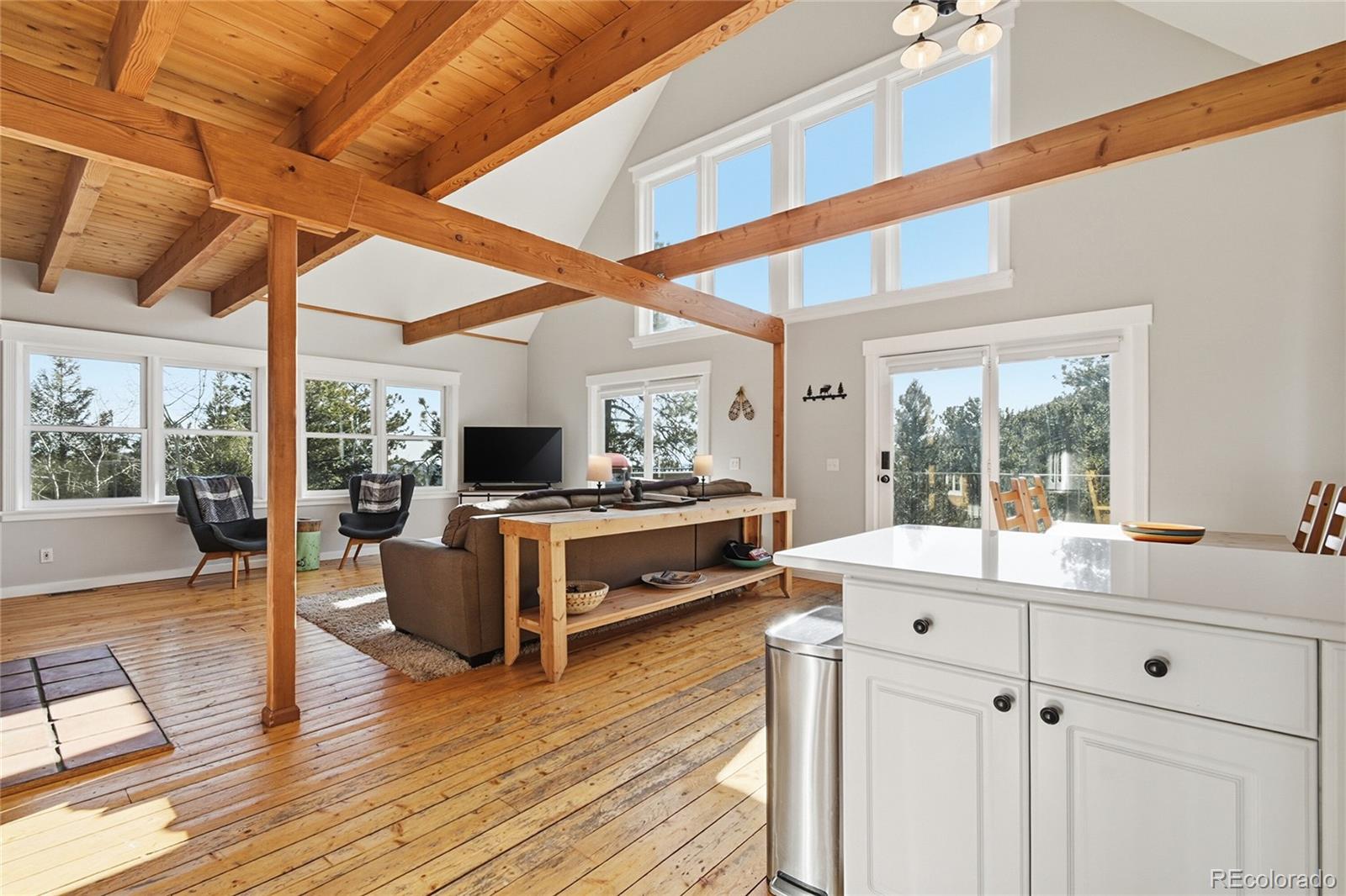 This open, sun-drenched chalet-style A-frame welcomes you with soaring ceilings, exposed beams, and gorgeous spruce pine and oak flooring that add warmth and character throughout. The kitchen is equipped with newer KitchenAid appliances, including a gas range, and new quartz counters making it perfect for everyday living or hosting friends after a day in the mountains. Natural gas heat and a cozy wood-burning gas stove keep the home comfortable year-round.