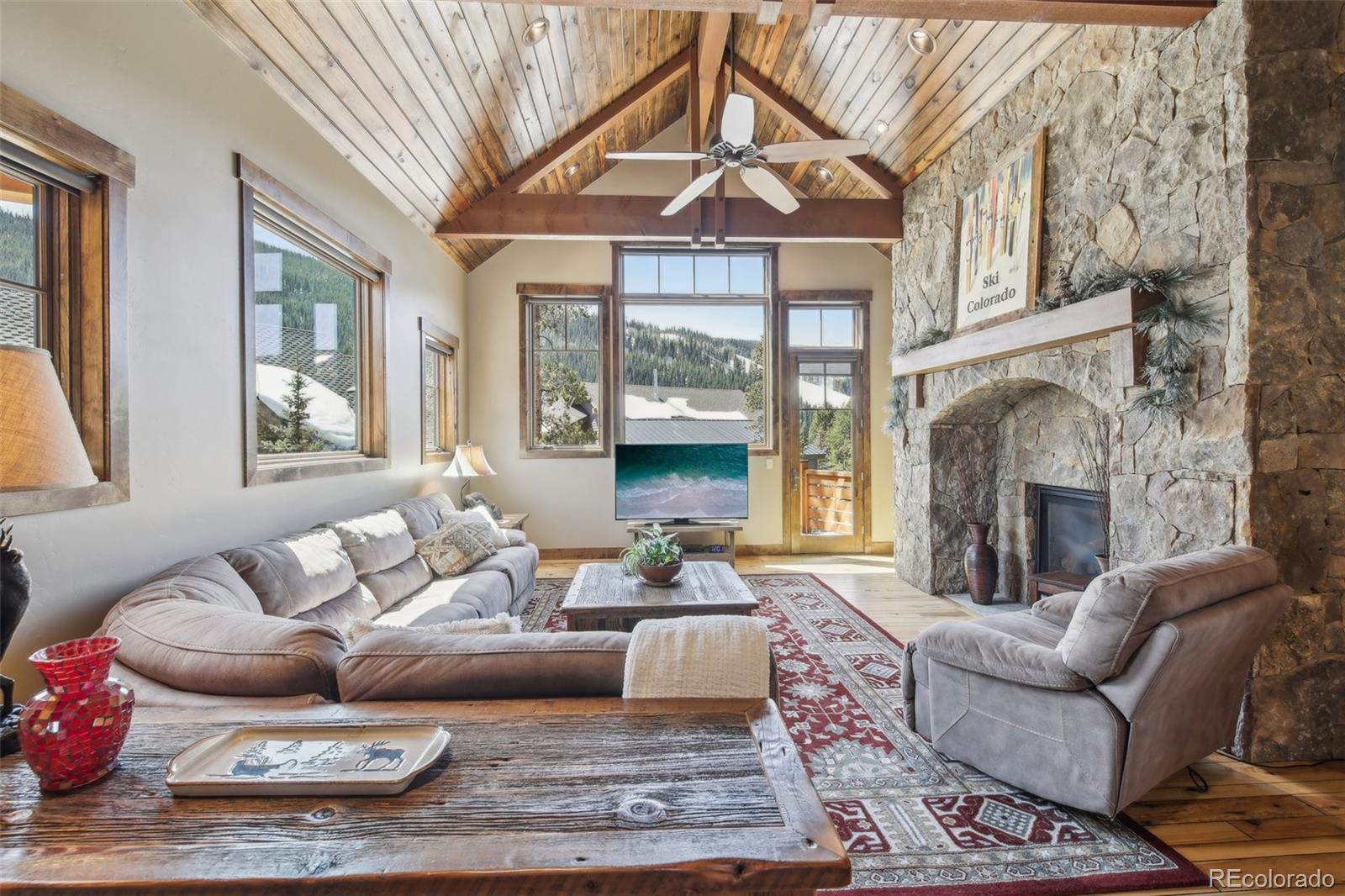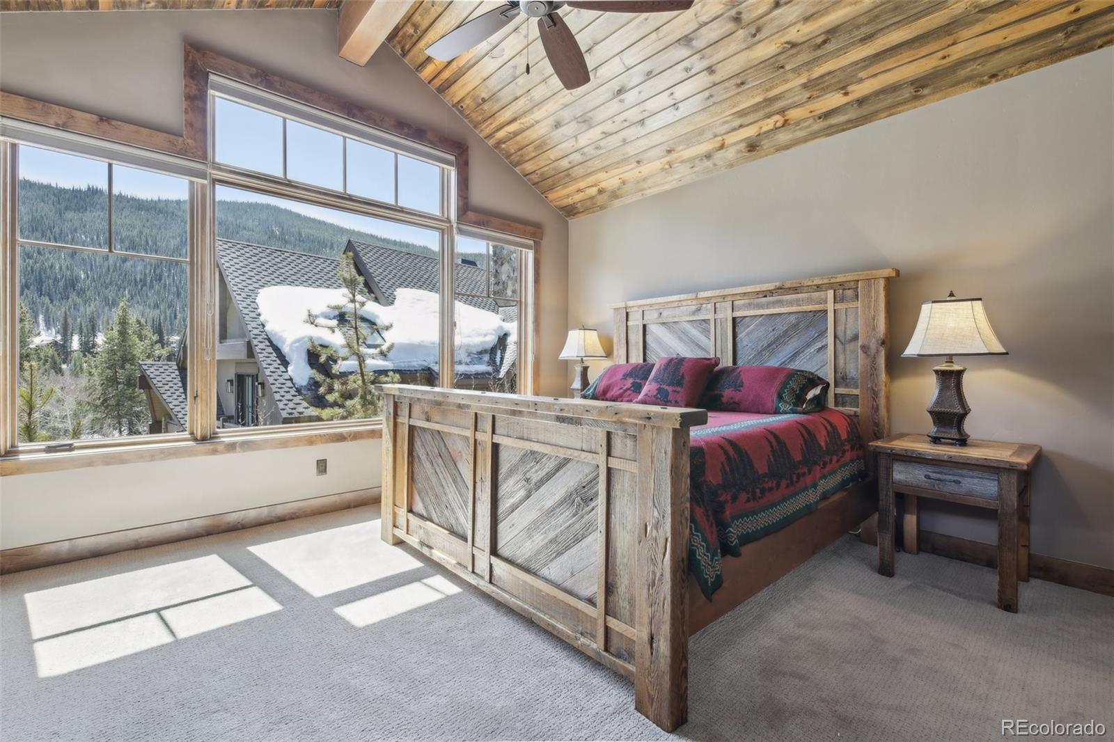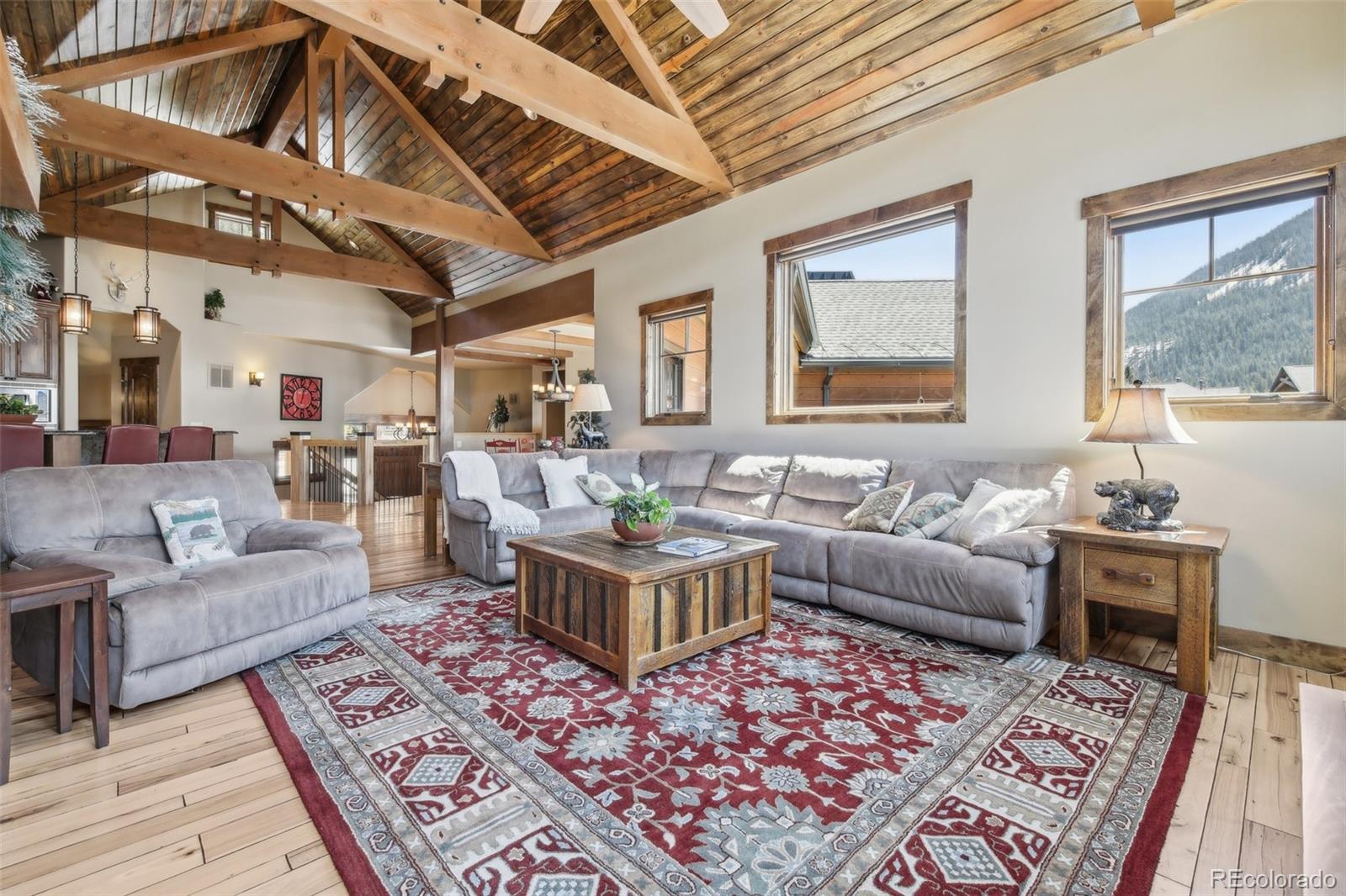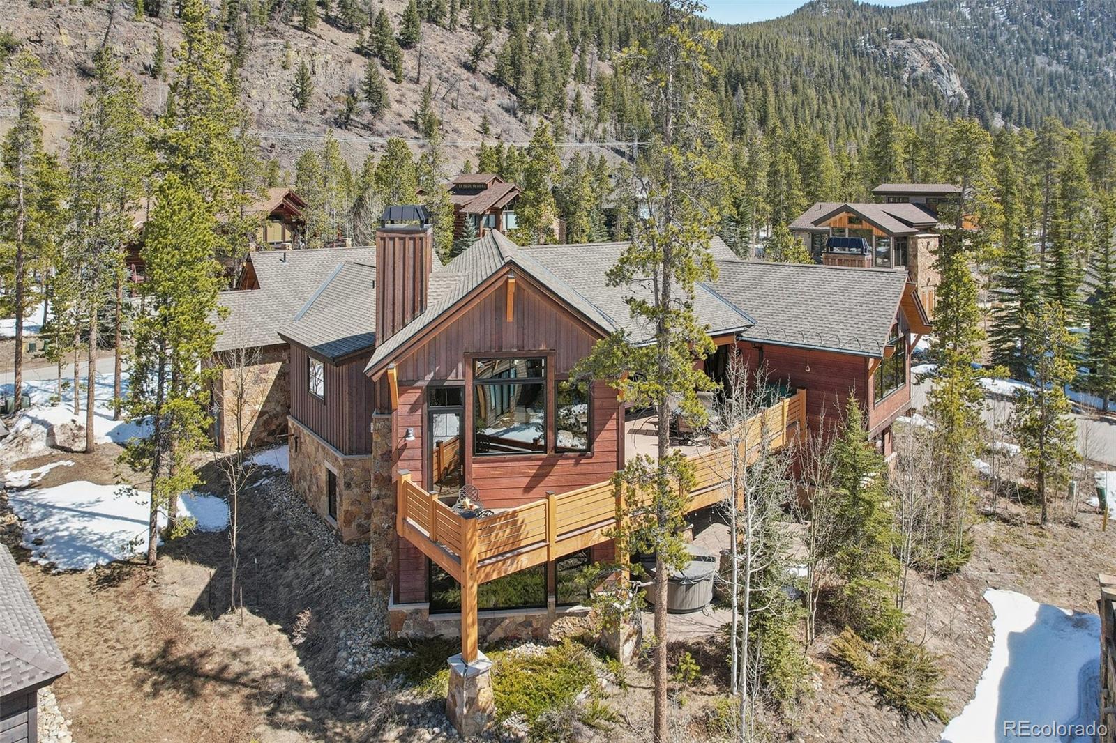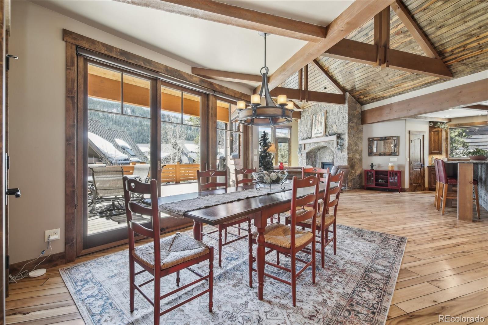 Located just an 8-minute walk to the Keystone Gondola, this home offers unmatched convenience for ski enthusiasts. Unlike most homes in Keystone, this property boasts a rare combination of riverfront views and direct access to the slopes, making it a truly unique mountain retreat. This custom home features massive timber frame construction and natural Moss Rock masonry, both inside and out. Enjoy stunning views to the ski slopes and the Snake River. The open floorplan is anchored with hickory hardwood floors, soaring vaulted ceilings and spectacular fireplaces. The chefs' kitchen features custom cabinetry, premium Dacor appliances, a walk-in pantry, and an oversized granite island. This space flows seamlessly into a spacious dining area and opens onto an outdoor deck. The elegant Primary Suite on the elevated main floor features a luxurious bath with twin vanities, steam shower, deep soaking tub and walk in closet. Bath is attached to the vaulted primary bedroom with wall of windows viewing the Snake River. Three more finely appointed suites plus an Office with hall bath continue the private spaces for everyone to enjoy privacy and solace. The walk-out lower level second living area boasts a charming wet bar, spacious entertaining space with moss rock fireplace, shuffleboard table and outdoor patio with spa. Imagine relaxing in your private spa under the stars after a day on the slopes, or hosting memorable gatherings with friends and family in your inviting living spaces. This home serves as a gateway to endless outdoor adventures, accommodating flexible schedules for all family members. If you're looking for a Resort Home that you can also offer as a Short Term Rental, look no further!