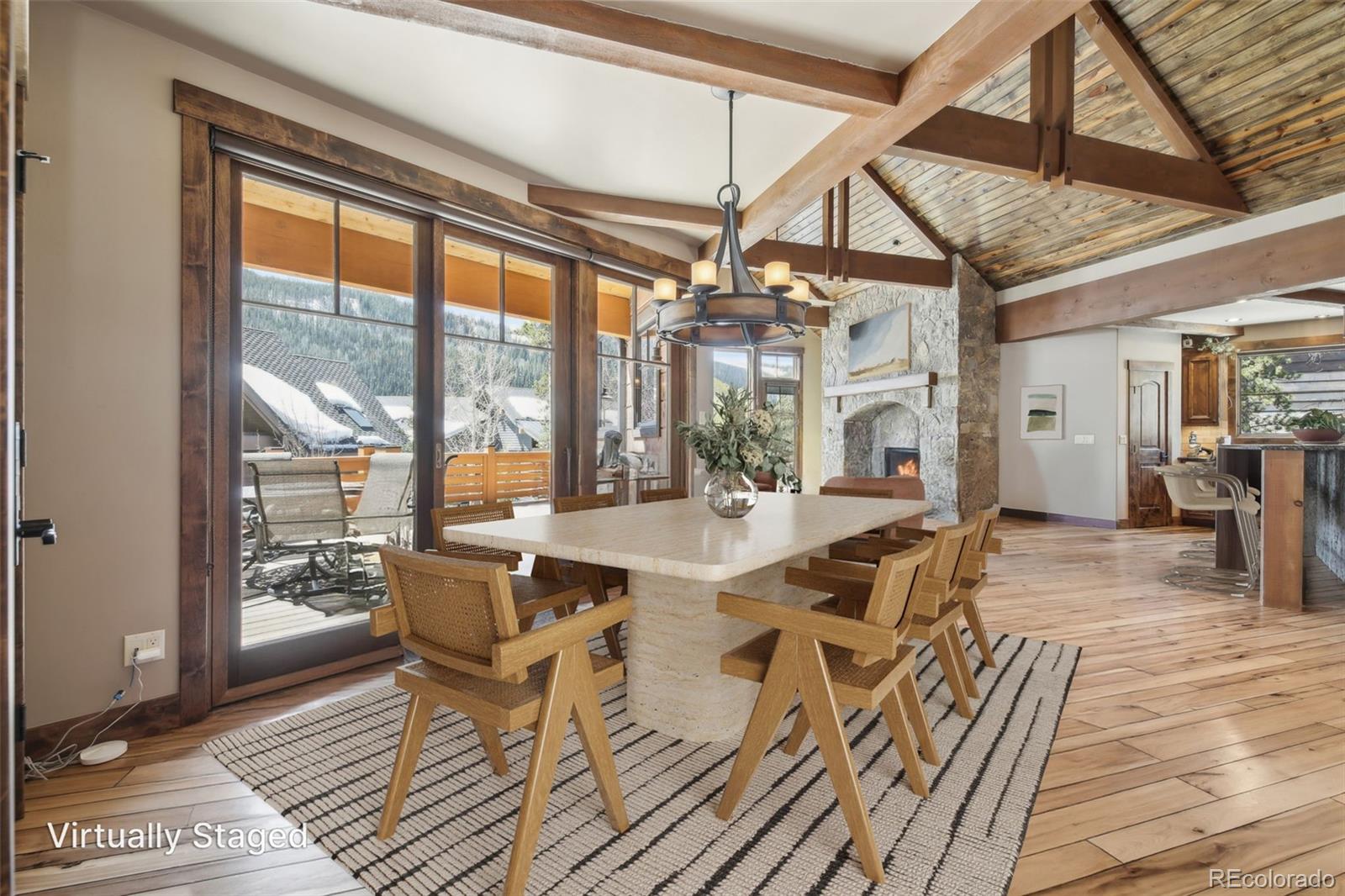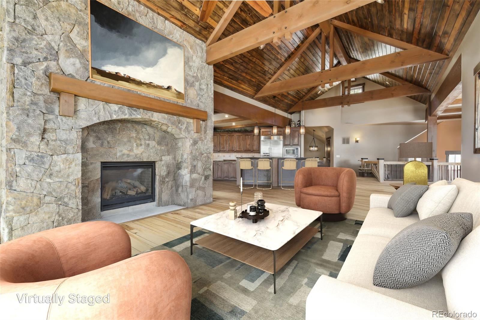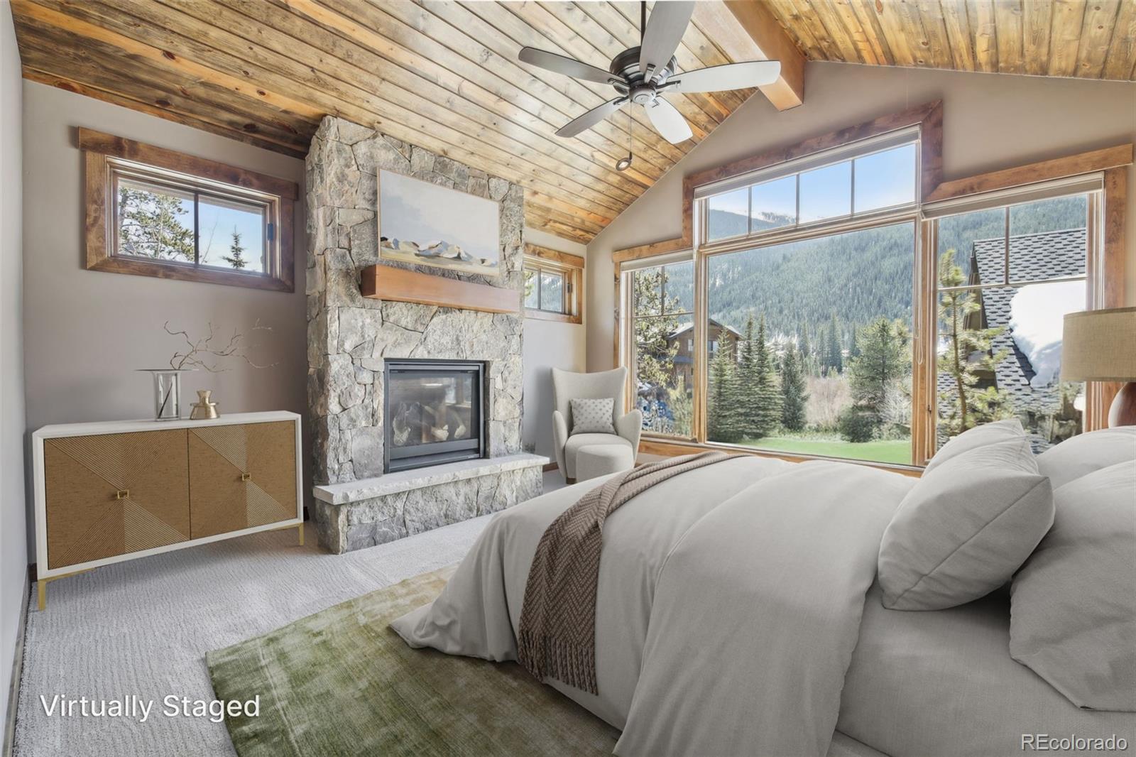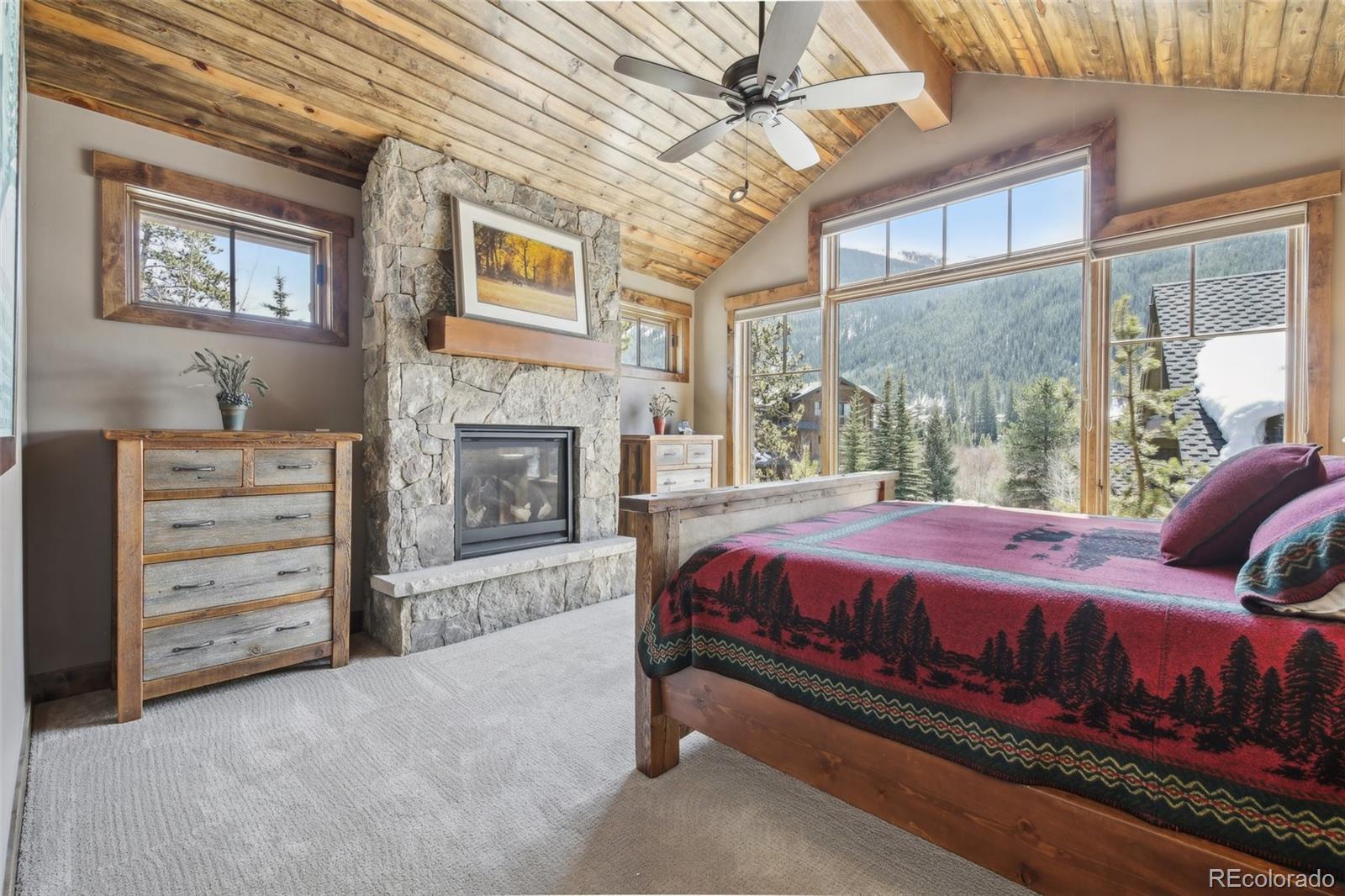 Located just an 8-minute walk to the Keystone Gondola, this home offers unmatched convenience for ski enthusiasts. Unlike most homes in Keystone, this property boasts a rare combination of riverfront views and direct access to the slopes, making it a truly unique mountain retreat. This custom home features massive timber frame construction and natural Moss Rock masonry, both inside and out. Enjoy stunning views to the ski slopes and the Snake River. The open floorplan is anchored with hickory hardwood floors, soaring vaulted ceilings and spectacular fireplaces. The chefs' kitchen features custom cabinetry, premium Dacor appliances, a walk-in pantry, and an oversized granite island. This space flows seamlessly into a spacious dining area and opens onto an outdoor deck. The elegant Primary Suite on the elevated main floor features a luxurious bath with twin vanities, steam shower, deep soaking tub and walk in closet. Bath is attached to the vaulted primary bedroom with wall of windows viewing the Snake River. Three more finely appointed suites plus an Office with hall bath continue the private spaces for everyone to enjoy privacy and solace. The walk-out lower level second living area boasts a charming wet bar, spacious entertaining space with moss rock fireplace, shuffleboard table and outdoor patio with spa. Imagine relaxing in your private spa under the stars after a day on the slopes, or hosting memorable gatherings with friends and family in your inviting living spaces. This home serves as a gateway to endless outdoor adventures, accommodating flexible schedules for all family members. If you're looking for a Resort Home that you can also offer as a Short Term Rental, look no further!
