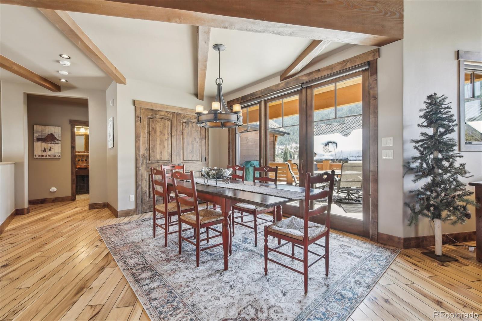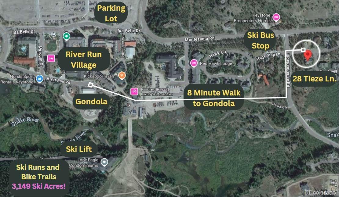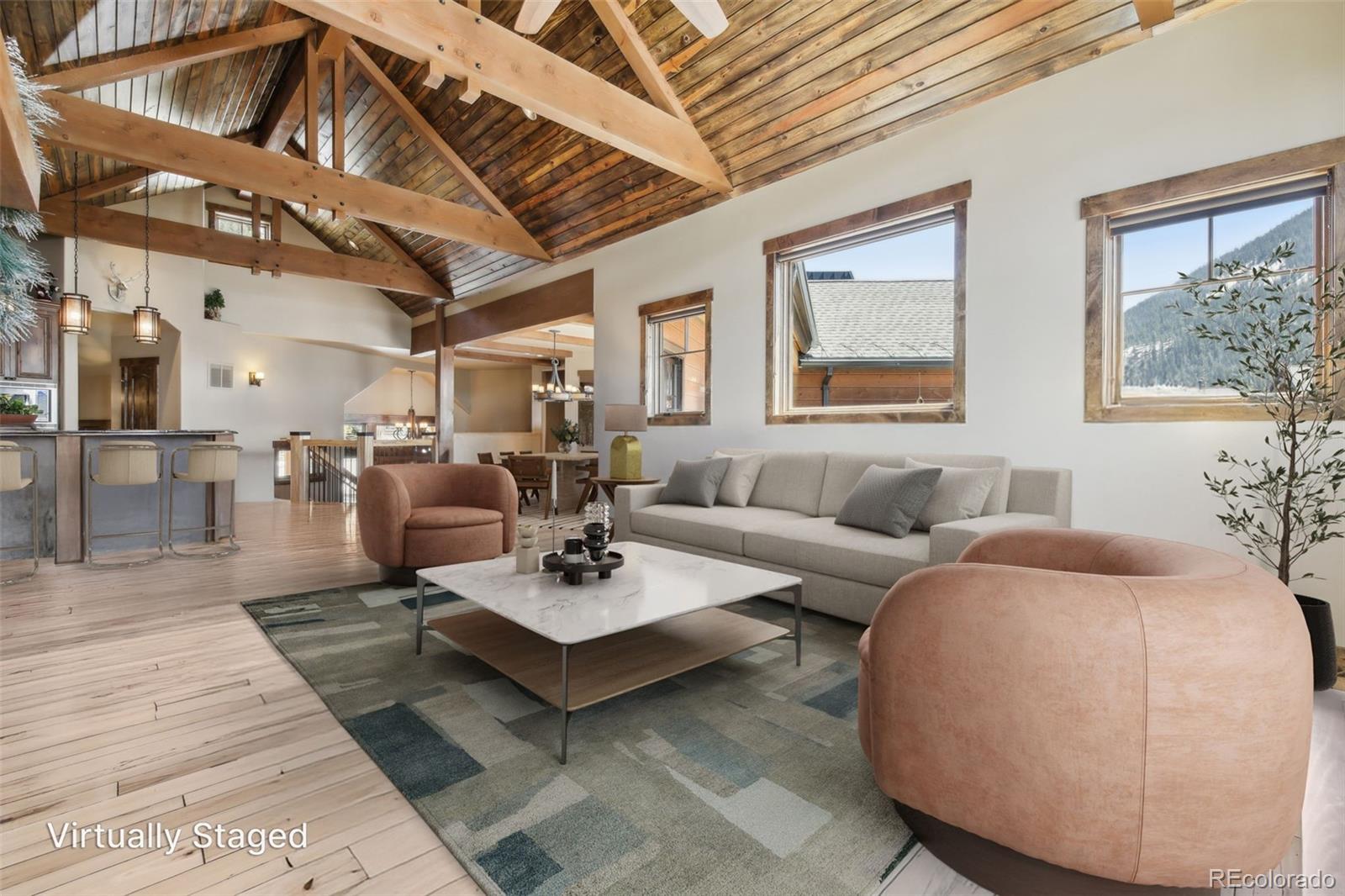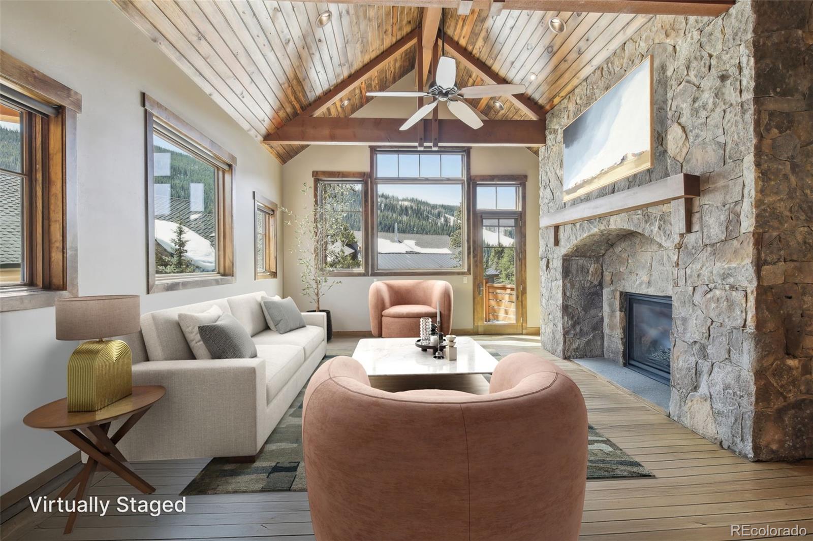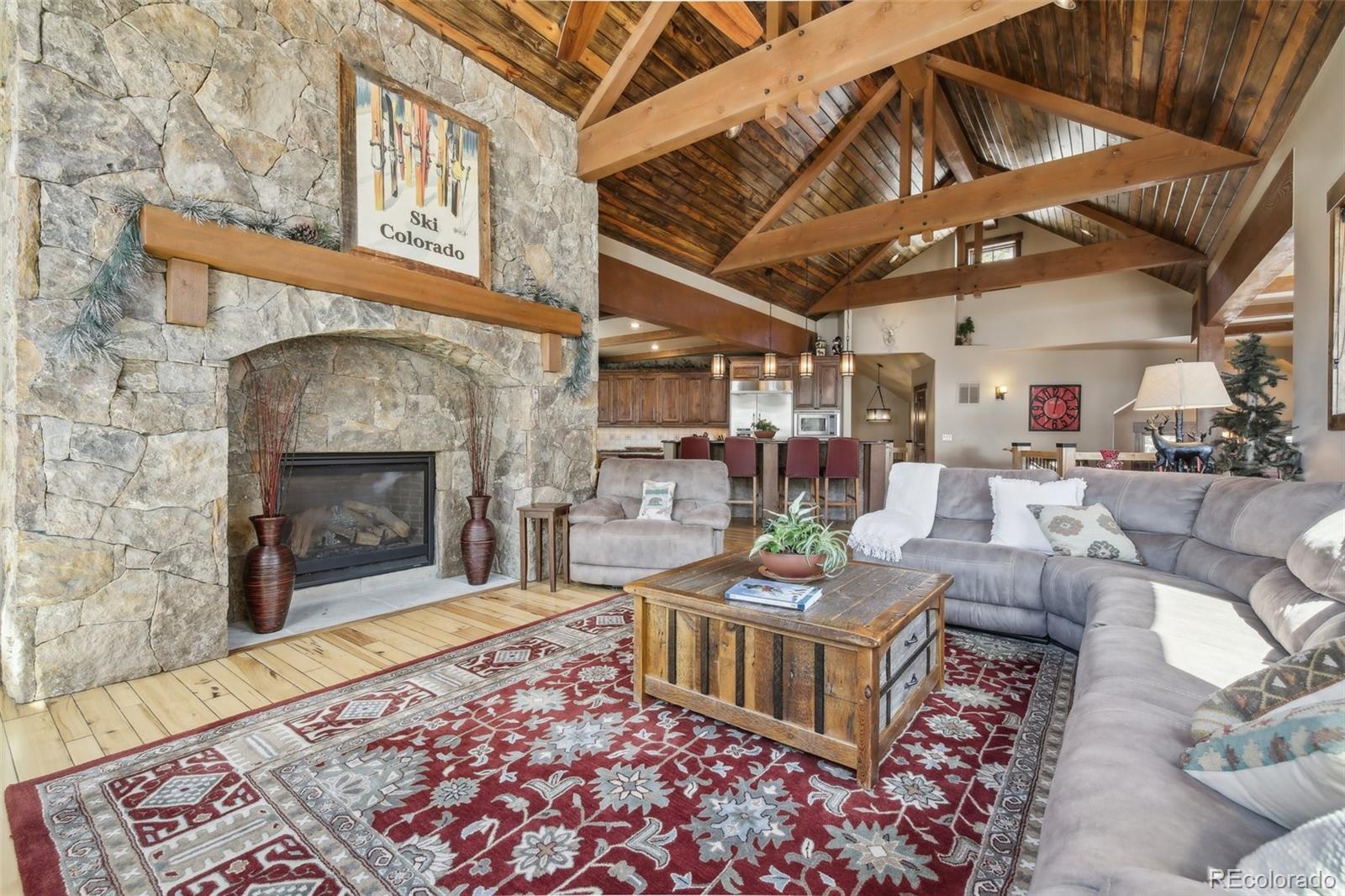 Located just an 8-minute walk to the Keystone Gondola, this home offers unmatched convenience for ski enthusiasts. Unlike most homes in Keystone, this property boasts a rare combination of riverfront views and direct access to the slopes, making it a truly unique mountain retreat. This custom home features massive timber frame construction and natural Moss Rock masonry, both inside and out. Enjoy stunning views to the ski slopes and the Snake River. The open floorplan is anchored with hickory hardwood floors, soaring vaulted ceilings and spectacular fireplaces. The chefs' kitchen features custom cabinetry, premium Dacor appliances, a walk-in pantry, and an oversized granite island. This space flows seamlessly into a spacious dining area and opens onto an outdoor deck. The elegant Primary Suite on the elevated main floor features a luxurious bath with twin vanities, steam shower, deep soaking tub and walk in closet. Bath is attached to the vaulted primary bedroom with wall of windows viewing the Snake River. Three more finely appointed suites plus an Office with hall bath continue the private spaces for everyone to enjoy privacy and solace. The walk-out lower level second living area boasts a charming wet bar, spacious entertaining space with moss rock fireplace, shuffleboard table and outdoor patio with spa. Imagine relaxing in your private spa under the stars after a day on the slopes, or hosting memorable gatherings with friends and family in your inviting living spaces. This home serves as a gateway to endless outdoor adventures, accommodating flexible schedules for all family members. If you're looking for a Resort Home that you can also offer as a Short Term Rental, look no further!