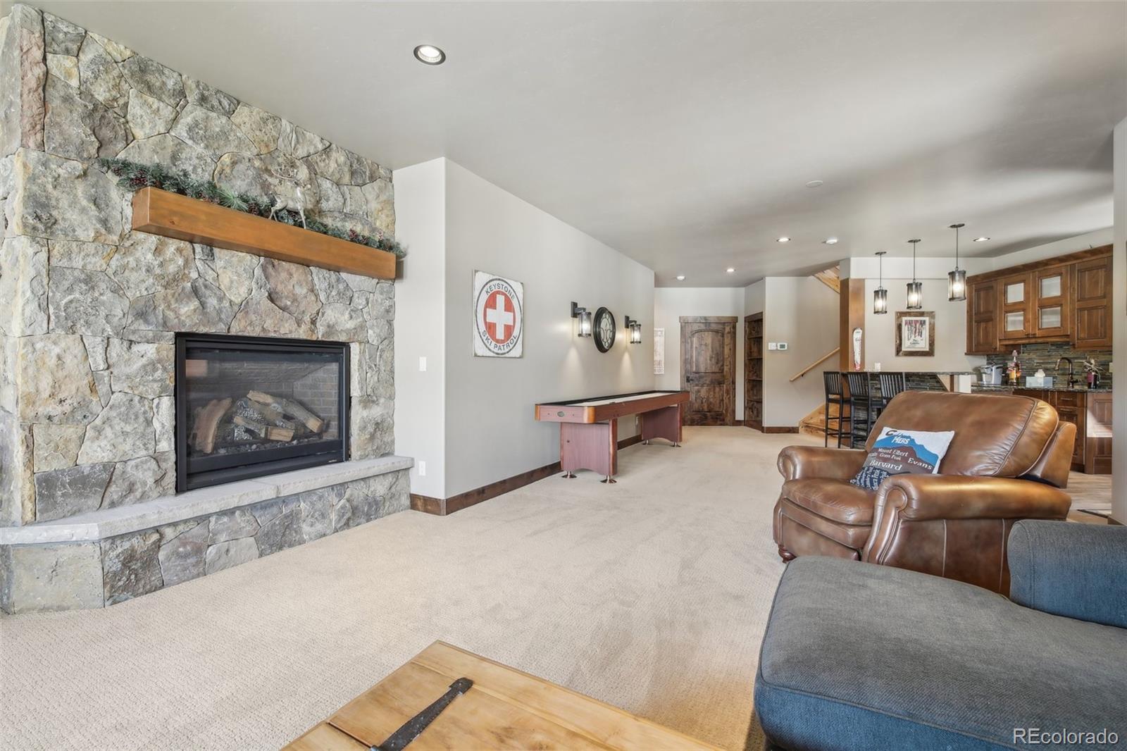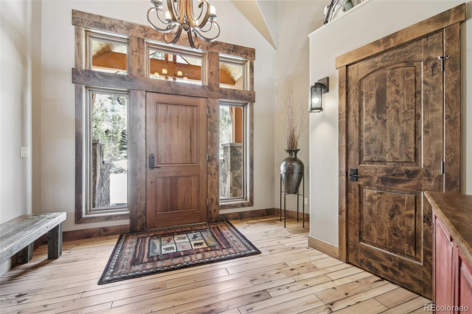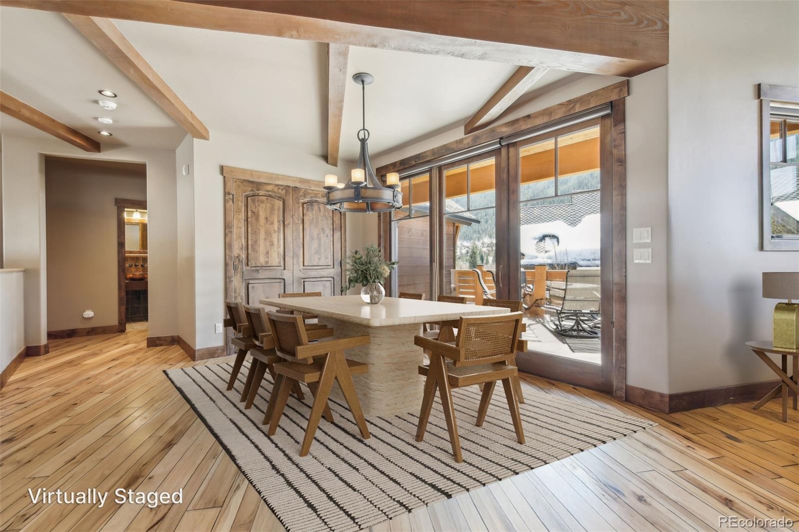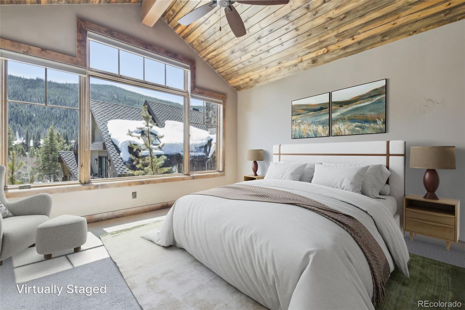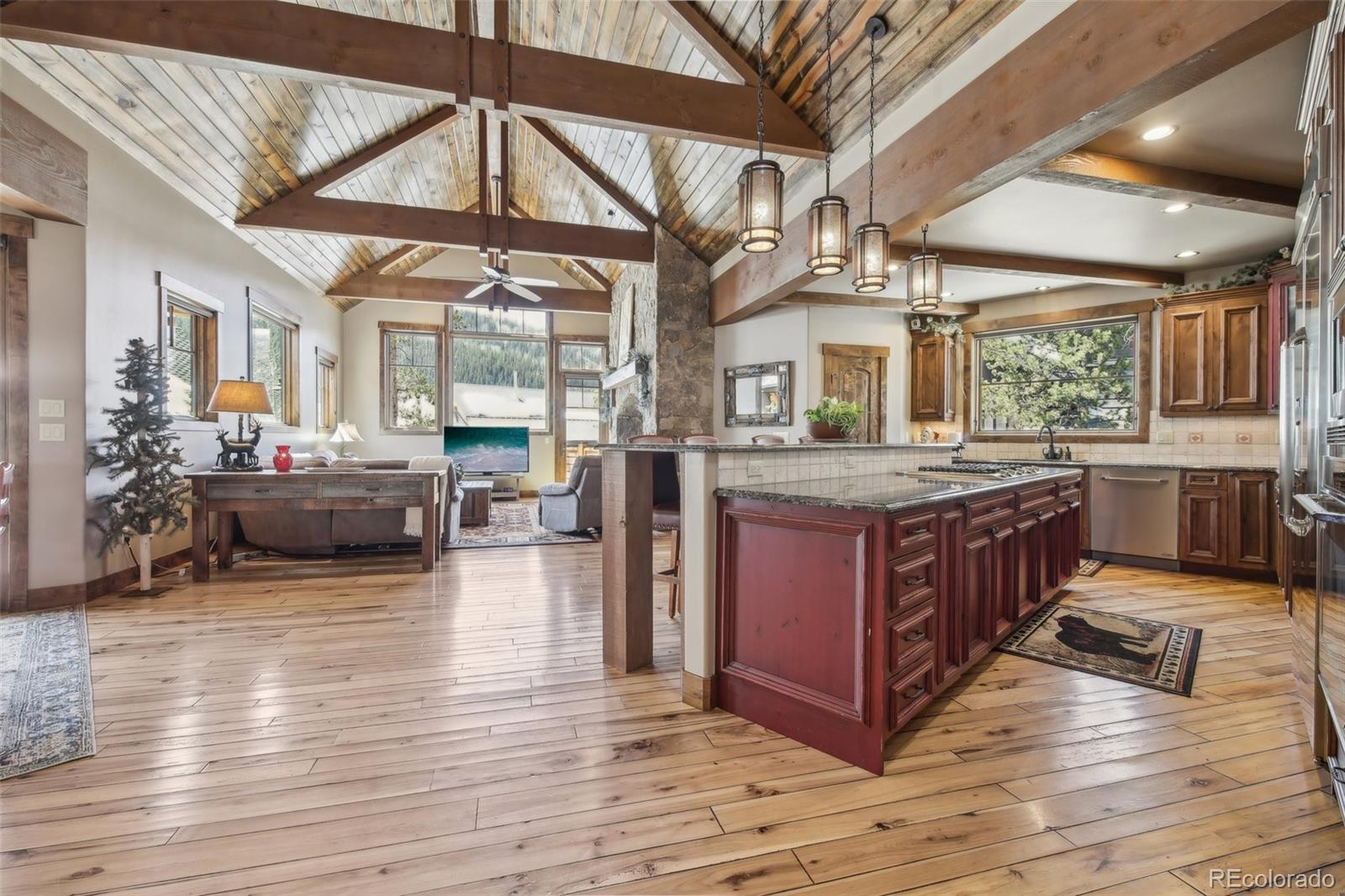 Located just an 8-minute walk to the Keystone Gondola, this home offers unmatched convenience for ski enthusiasts. Unlike most homes in Keystone, this property boasts a rare combination of riverfront views and direct access to the slopes, making it a truly unique mountain retreat. This custom home features massive timber frame construction and natural Moss Rock masonry, both inside and out. Enjoy stunning views to the ski slopes and the Snake River. The open floorplan is anchored with hickory hardwood floors, soaring vaulted ceilings and spectacular fireplaces. The chefs' kitchen features custom cabinetry, premium Dacor appliances, a walk-in pantry, and an oversized granite island. This space flows seamlessly into a spacious dining area and opens onto an outdoor deck. The elegant Primary Suite on the elevated main floor features a luxurious bath with twin vanities, steam shower, deep soaking tub and walk in closet. Bath is attached to the vaulted primary bedroom with wall of windows viewing the Snake River. Three more finely appointed suites plus an Office with hall bath continue the private spaces for everyone to enjoy privacy and solace. The walk-out lower level second living area boasts a charming wet bar, spacious entertaining space with moss rock fireplace, shuffleboard table and outdoor patio with spa. Imagine relaxing in your private spa under the stars after a day on the slopes, or hosting memorable gatherings with friends and family in your inviting living spaces. This home serves as a gateway to endless outdoor adventures, accommodating flexible schedules for all family members. If you're looking for a Resort Home that you can also offer as a Short Term Rental, look no further!