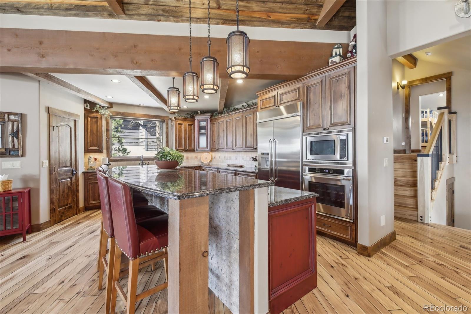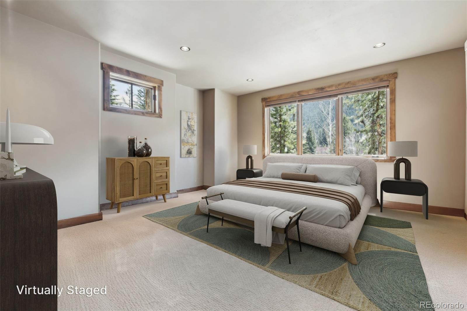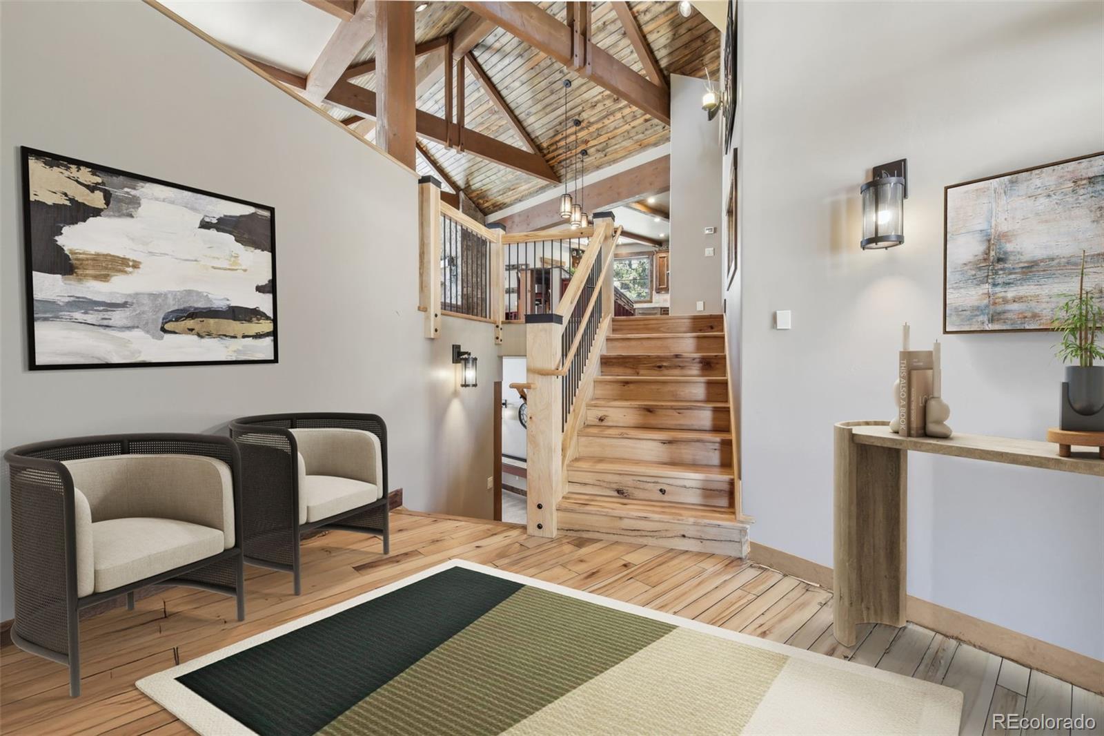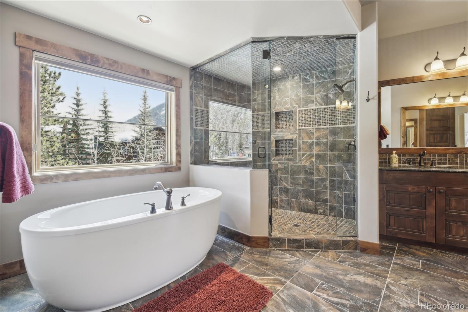 Located just an 8-minute walk to the Keystone Gondola, this home offers unmatched convenience for ski enthusiasts. Unlike most homes in Keystone, this property boasts a rare combination of riverfront views and direct access to the slopes, making it a truly unique mountain retreat. This custom home features massive timber frame construction and natural Moss Rock masonry, both inside and out. Enjoy stunning views to the ski slopes and the Snake River. The open floorplan is anchored with hickory hardwood floors, soaring vaulted ceilings and spectacular fireplaces. The chefs' kitchen features custom cabinetry, premium Dacor appliances, a walk-in pantry, and an oversized granite island. This space flows seamlessly into a spacious dining area and opens onto an outdoor deck. The elegant Primary Suite on the elevated main floor features a luxurious bath with twin vanities, steam shower, deep soaking tub and walk in closet. Bath is attached to the vaulted primary bedroom with wall of windows viewing the Snake River. Three more finely appointed suites plus an Office with hall bath continue the private spaces for everyone to enjoy privacy and solace. The walk-out lower level second living area boasts a charming wet bar, spacious entertaining space with moss rock fireplace, shuffleboard table and outdoor patio with spa. Imagine relaxing in your private spa under the stars after a day on the slopes, or hosting memorable gatherings with friends and family in your inviting living spaces. This home serves as a gateway to endless outdoor adventures, accommodating flexible schedules for all family members. If you're looking for a Resort Home that you can also offer as a Short Term Rental, look no further!