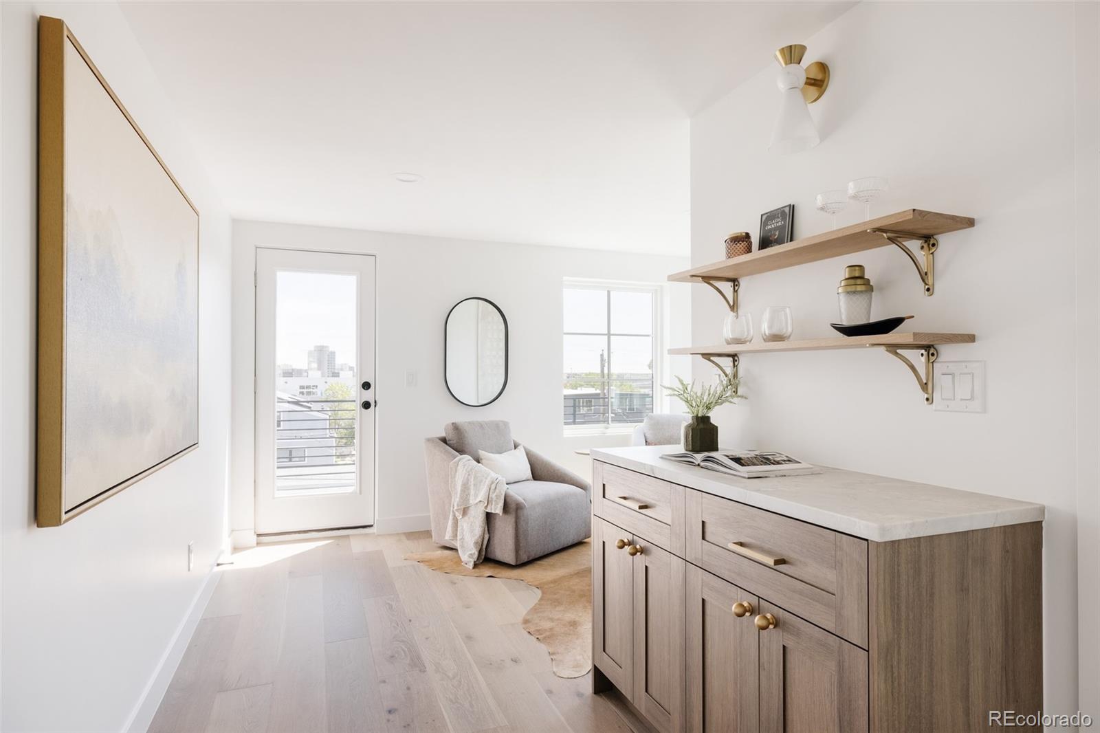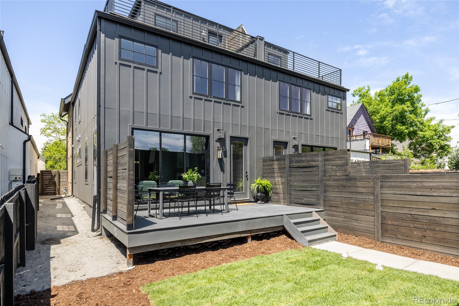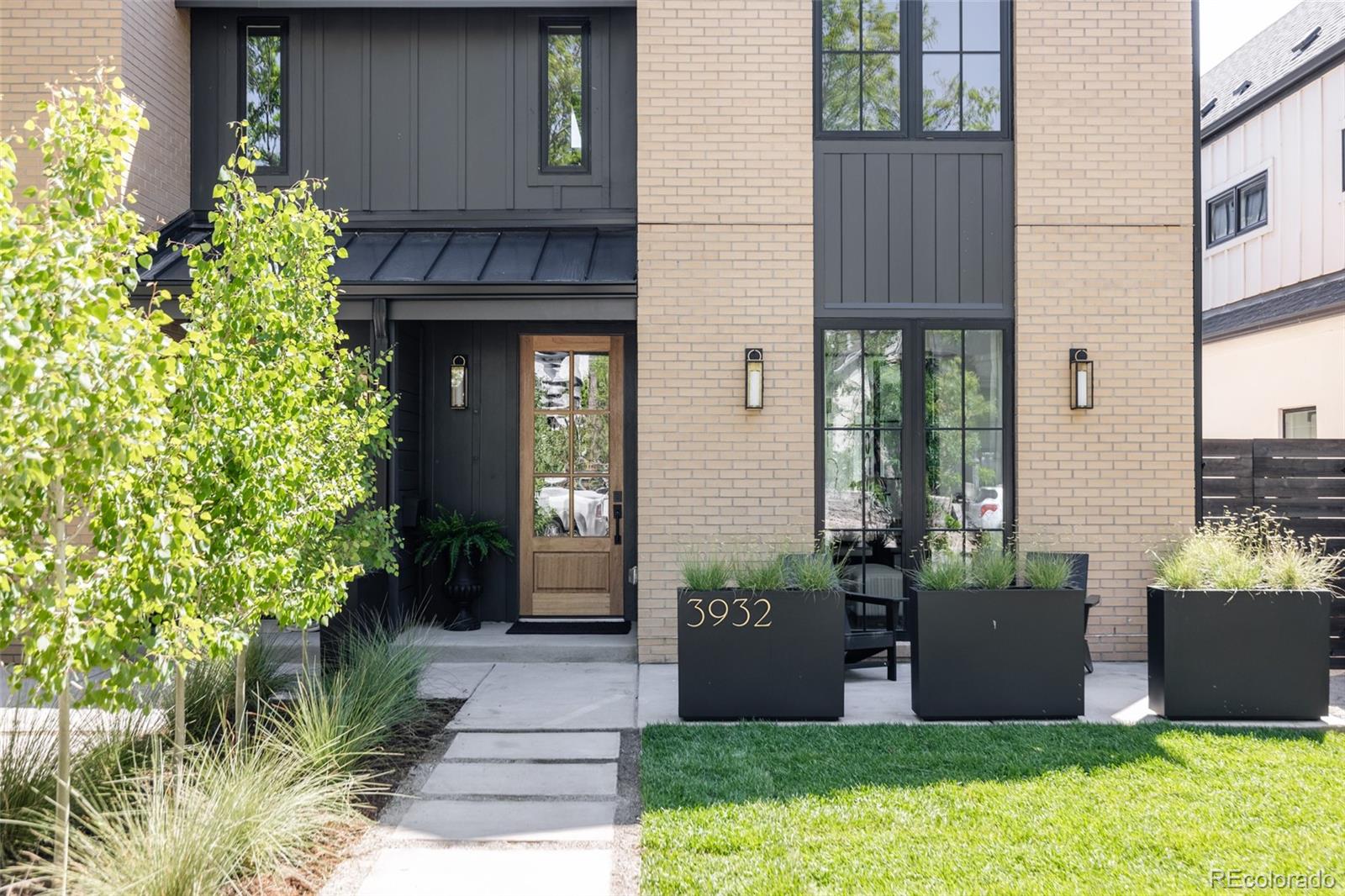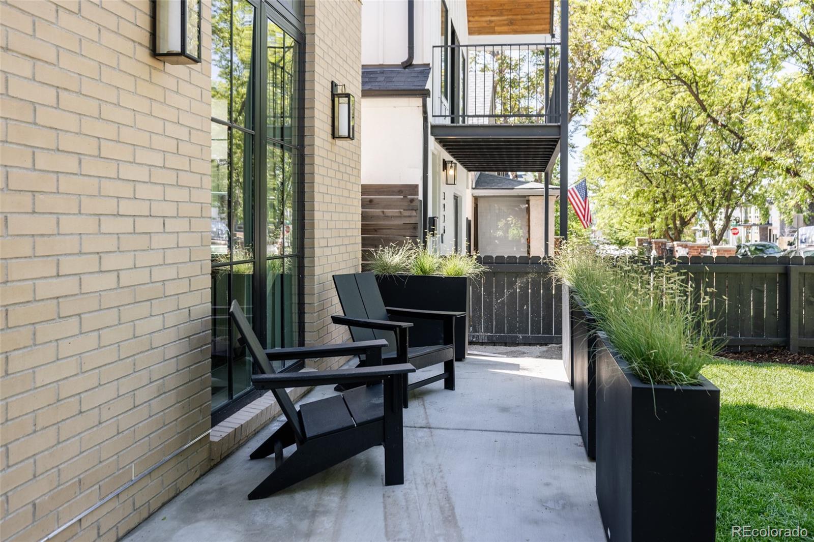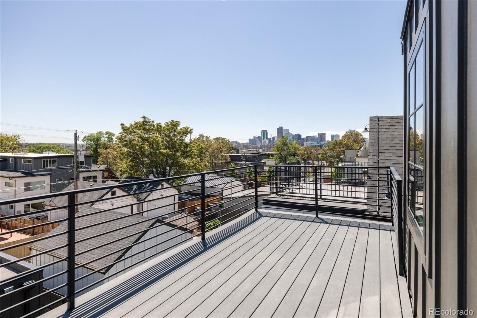 The quality construction and craftsmanship -- paired with a brick facade and elevation that respects its local neighborhood context -- truly make this a rare offering that stands apart from other builder-grade, stucco-box duplexes, while maintaining the same price point. The main floor features white oak hardwood floors, a hidden walk-in pantry, a separate office with custom steel doors, a built-in bar with marble tile, and a full triple sliding door that completely opens, blending indoor and outdoor living. The open living room flows onto the private back deck, with plenty of space for an eight-person outdoor dining table and a landscaped backyard -- perfect for entertaining. In addition, there is a spacious rooftop deck for patio seating, offering unparalleled, expansive views of the downtown Denver skyline. This residence also features a rare layout with three bedrooms on the same level, including a separate laundry room and a large primary suite. The eye-catching curb appeal is enhanced by lush landscaping and anchored by a cozy front sitting porch and covered entry. Located on a quiet neighborhood street, this desirable location is within a four-block walk of coffee shops, a cidery, a taco shop, restaurants, parks, CycleBar, and Fox St. Station, offering easy access to Union Station and DIA. Welcome home to your Goodhouse.
