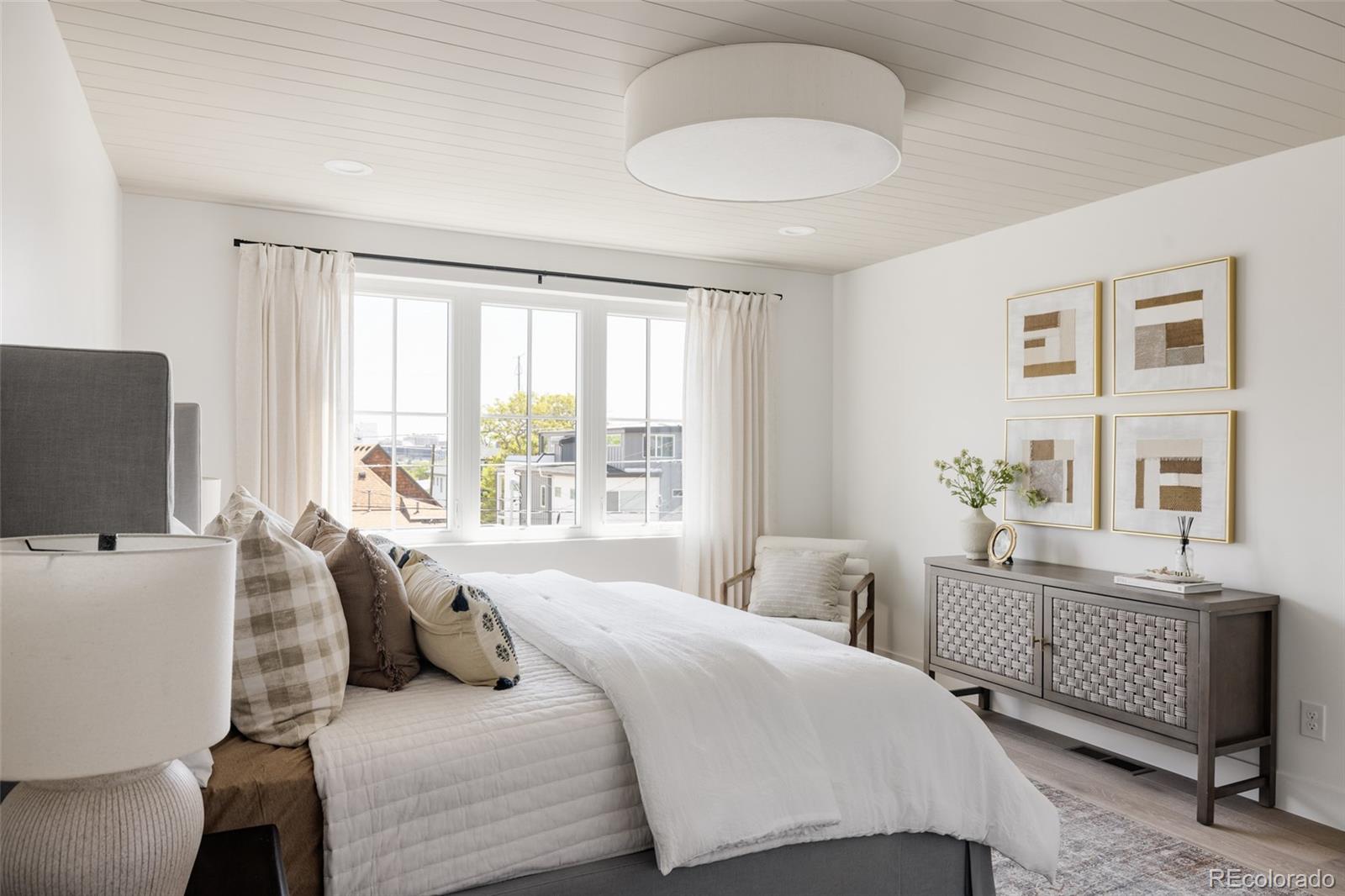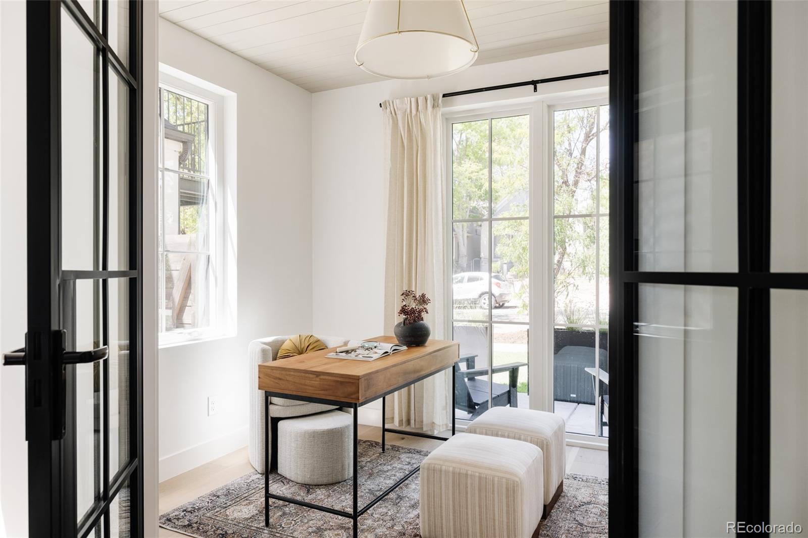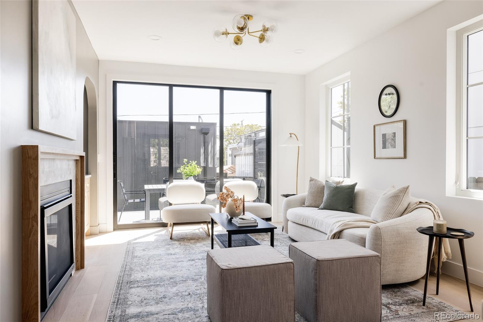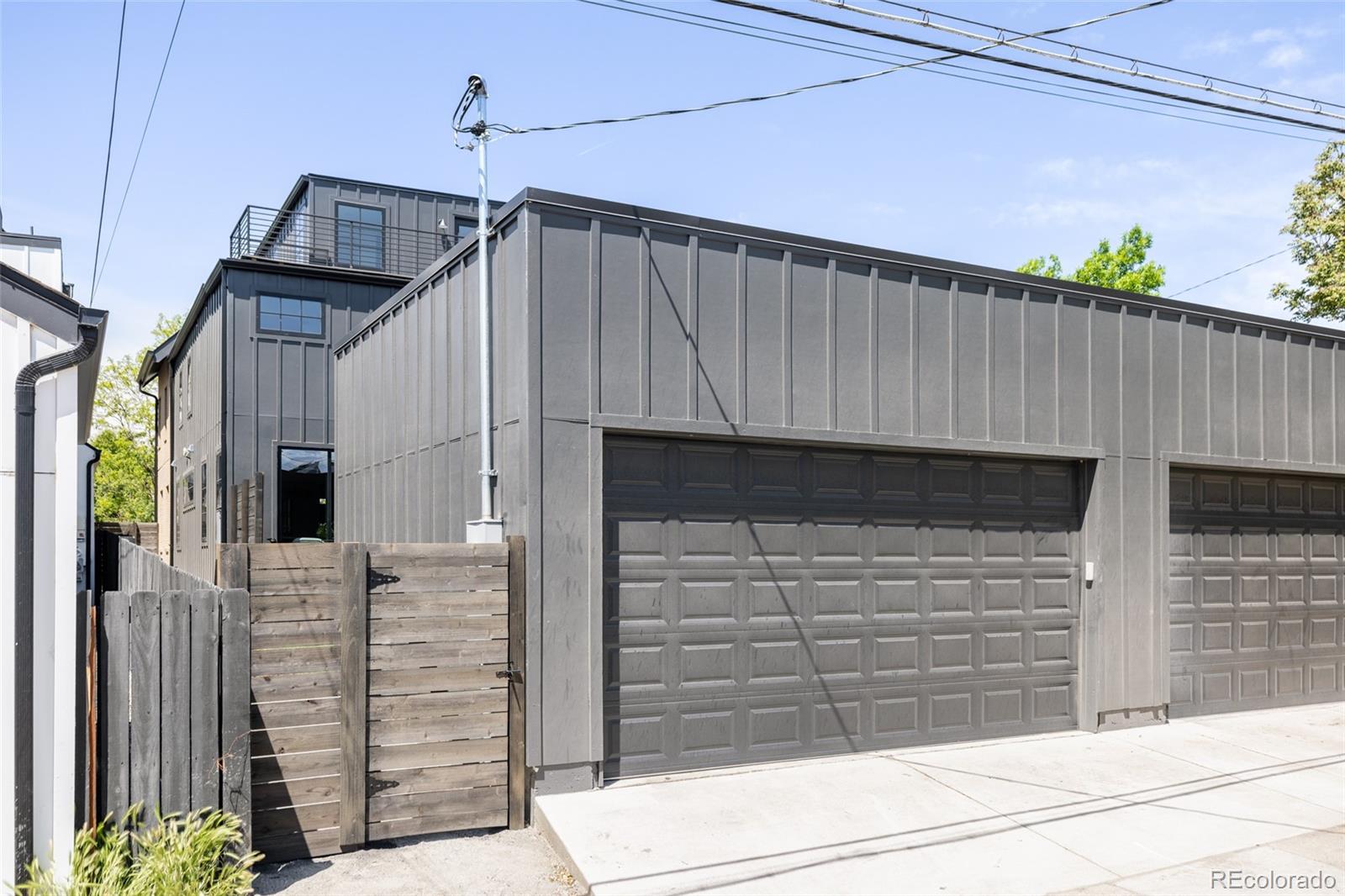 The quality construction and craftsmanship -- paired with a brick facade and elevation that respects its local neighborhood context -- truly make this a rare offering that stands apart from other builder-grade, stucco-box duplexes, while maintaining the same price point. The main floor features white oak hardwood floors, a hidden walk-in pantry, a separate office with custom steel doors, a built-in bar with marble tile, and a full triple sliding door that completely opens, blending indoor and outdoor living. The open living room flows onto the private back deck, with plenty of space for an eight-person outdoor dining table and a landscaped backyard -- perfect for entertaining. In addition, there is a spacious rooftop deck for patio seating, offering unparalleled, expansive views of the downtown Denver skyline. This residence also features a rare layout with three bedrooms on the same level, including a separate laundry room and a large primary suite. The eye-catching curb appeal is enhanced by lush landscaping and anchored by a cozy front sitting porch and covered entry. Located on a quiet neighborhood street, this desirable location is within a four-block walk of coffee shops, a cidery, a taco shop, restaurants, parks, CycleBar, and Fox St. Station, offering easy access to Union Station and DIA. Welcome home to your Goodhouse.