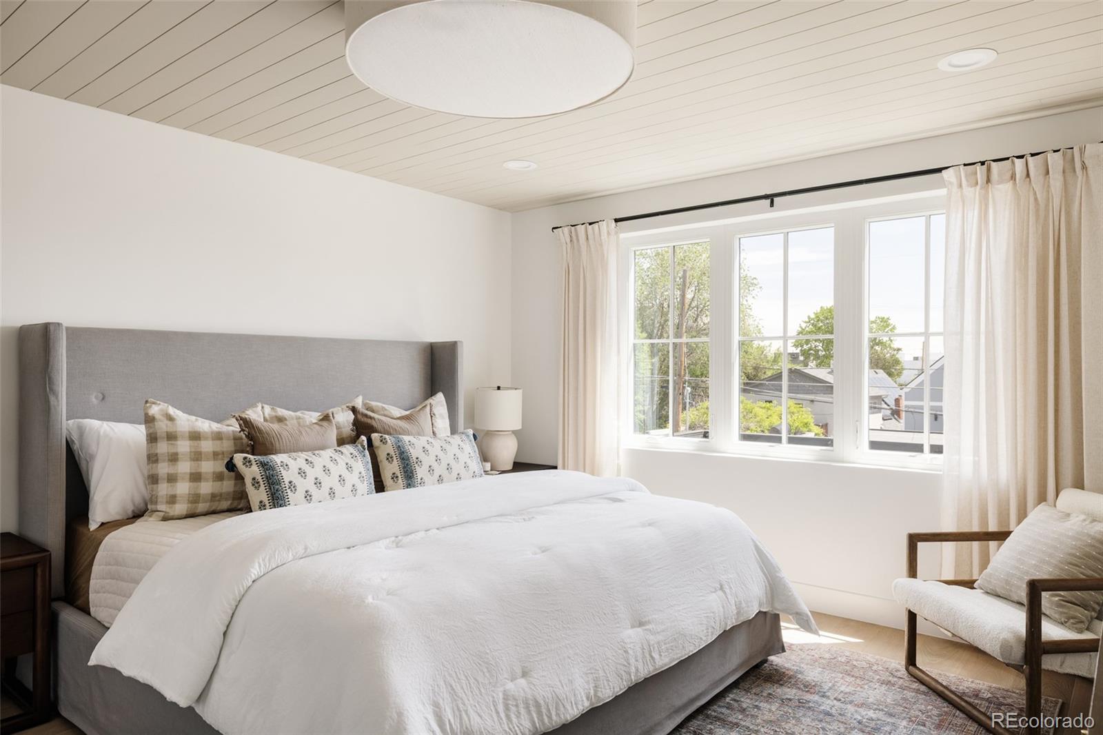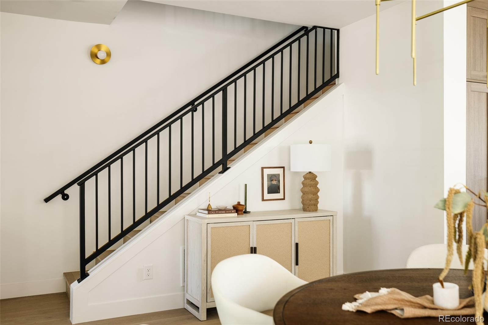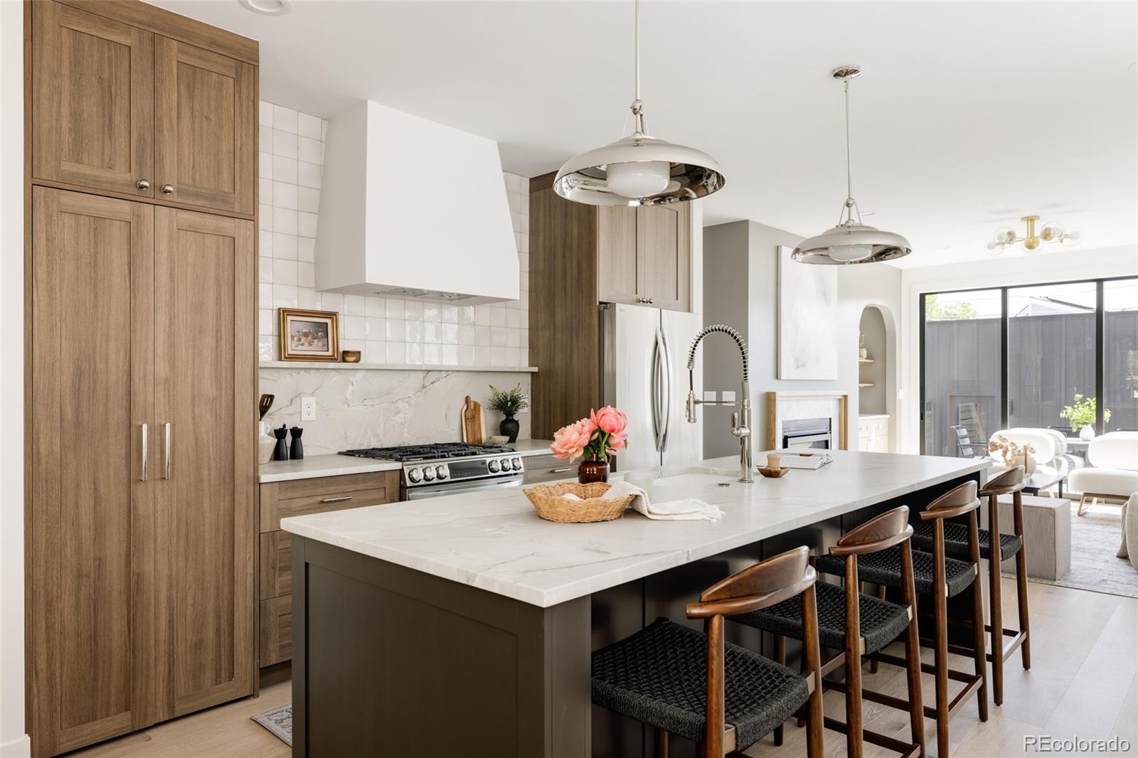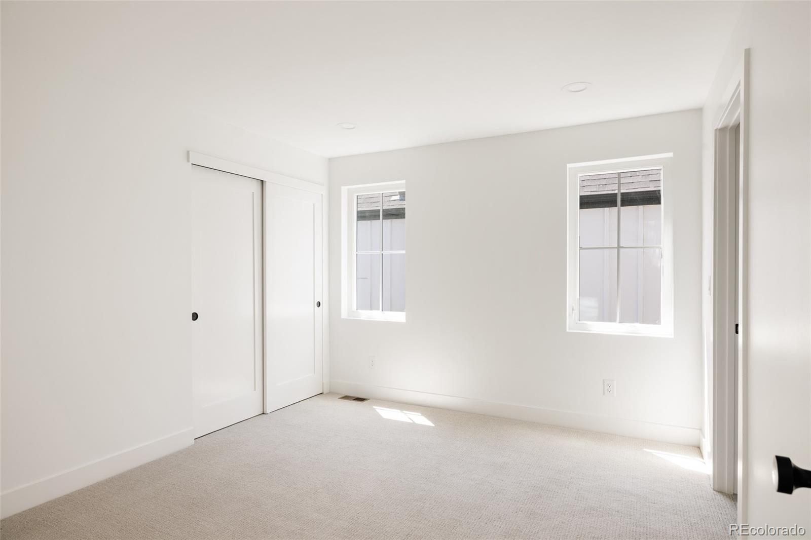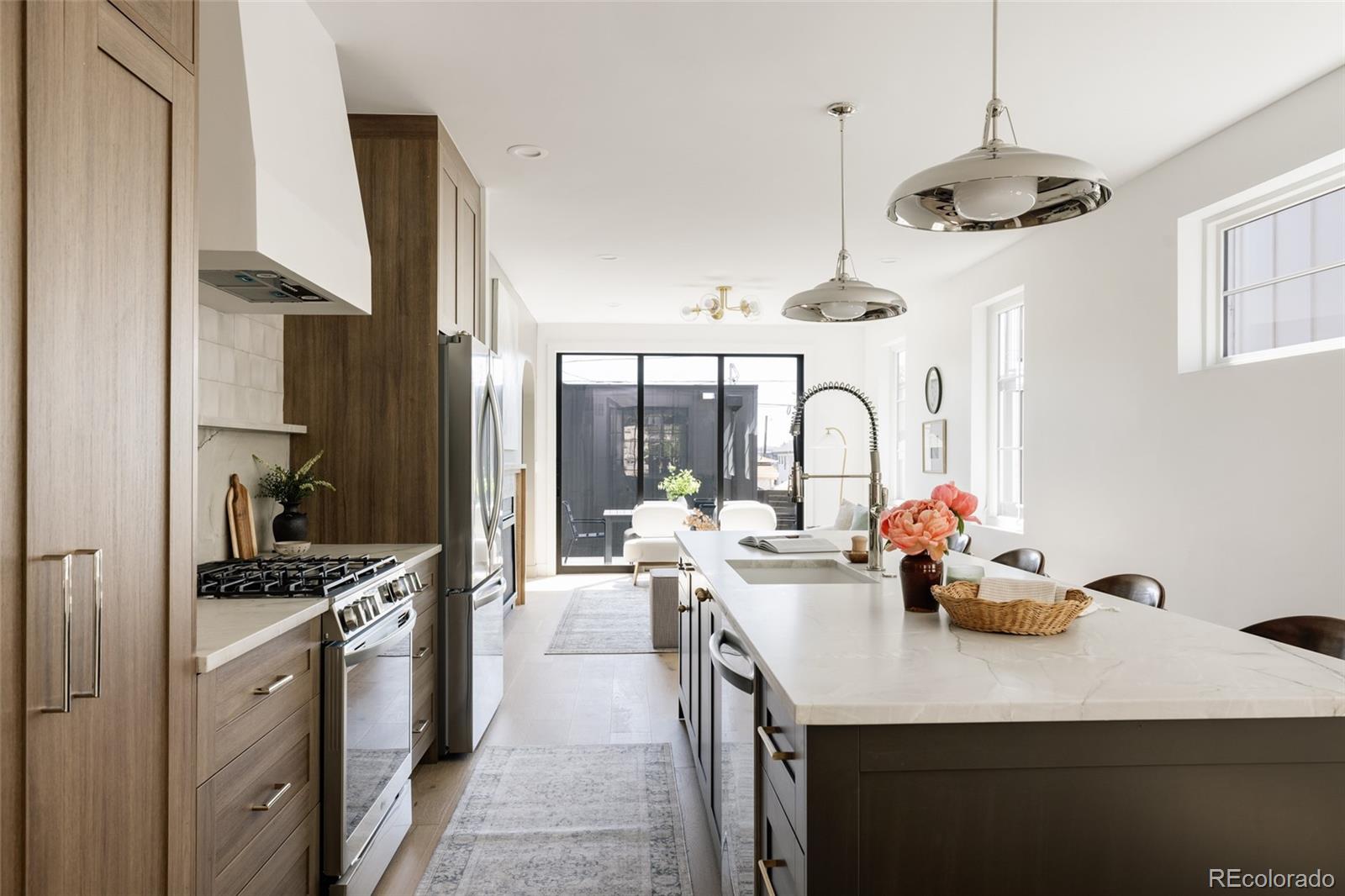 The quality construction and craftsmanship -- paired with a brick facade and elevation that respects its local neighborhood context -- truly make this a rare offering that stands apart from other builder-grade, stucco-box duplexes, while maintaining the same price point. The main floor features white oak hardwood floors, a hidden walk-in pantry, a separate office with custom steel doors, a built-in bar with marble tile, and a full triple sliding door that completely opens, blending indoor and outdoor living. The open living room flows onto the private back deck, with plenty of space for an eight-person outdoor dining table and a landscaped backyard -- perfect for entertaining. In addition, there is a spacious rooftop deck for patio seating, offering unparalleled, expansive views of the downtown Denver skyline. This residence also features a rare layout with three bedrooms on the same level, including a separate laundry room and a large primary suite. The eye-catching curb appeal is enhanced by lush landscaping and anchored by a cozy front sitting porch and covered entry. Located on a quiet neighborhood street, this desirable location is within a four-block walk of coffee shops, a cidery, a taco shop, restaurants, parks, CycleBar, and Fox St. Station, offering easy access to Union Station and DIA. Welcome home to your Goodhouse.