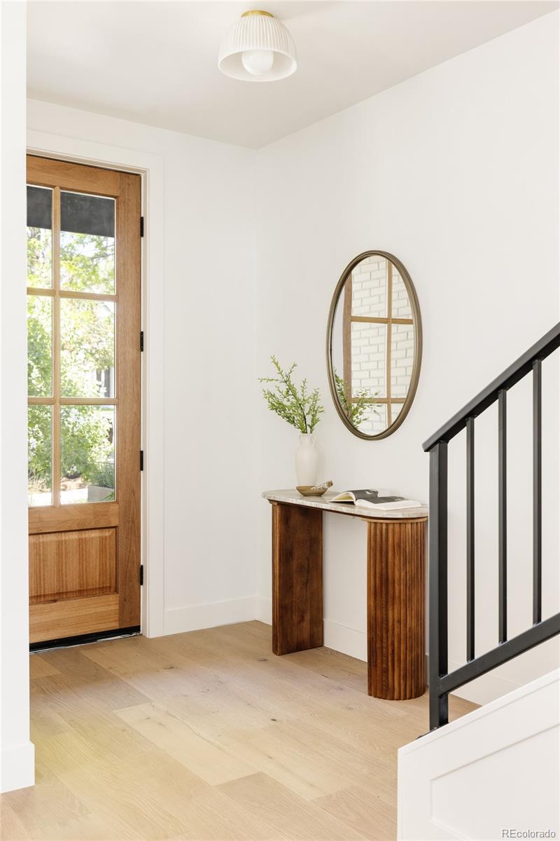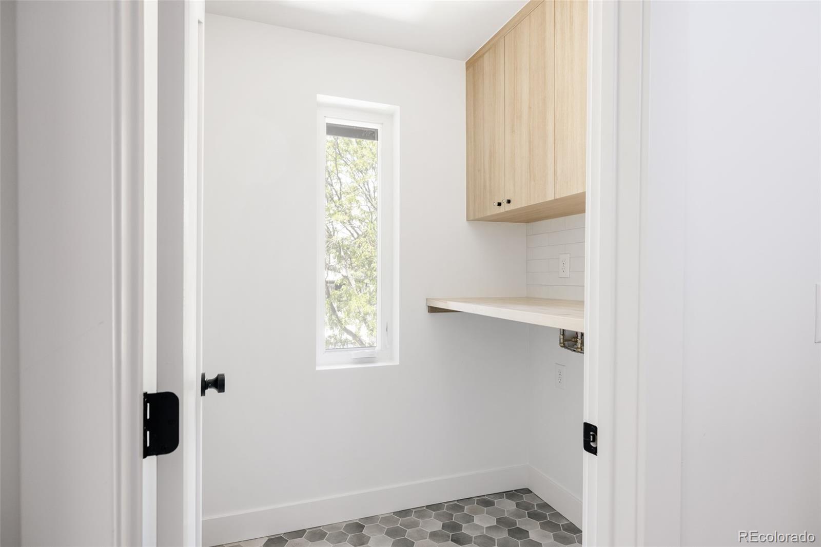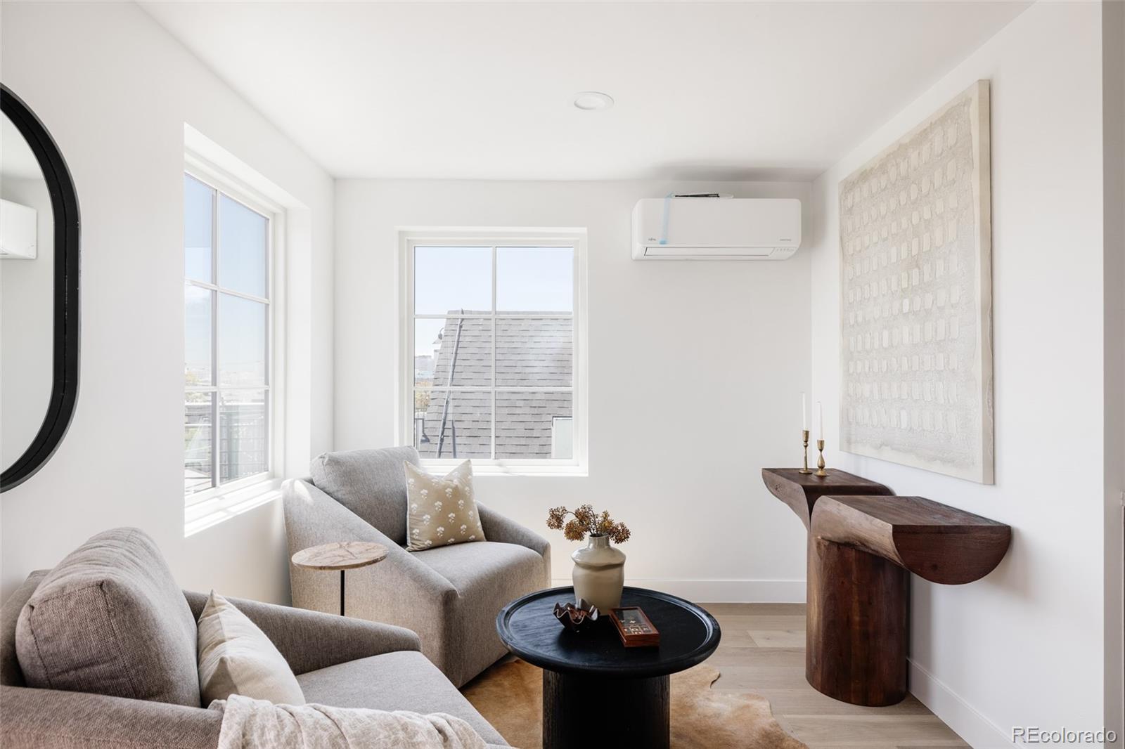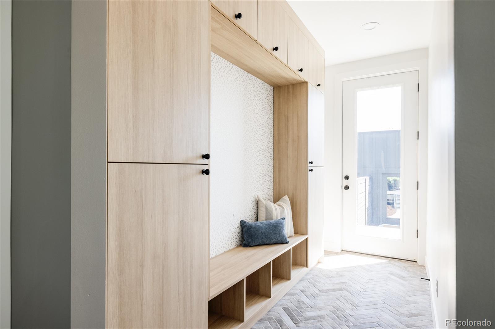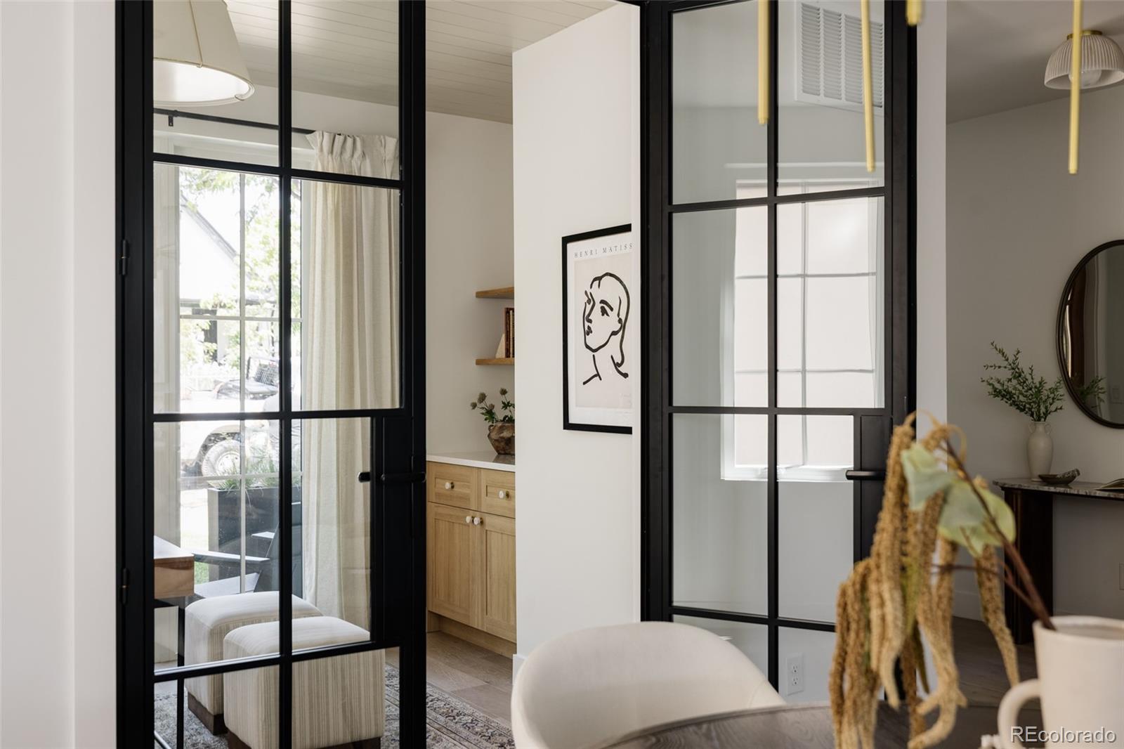 The quality construction and craftsmanship -- paired with a brick facade and elevation that respects its local neighborhood context -- truly make this a rare offering that stands apart from other builder-grade, stucco-box duplexes, while maintaining the same price point. The main floor features white oak hardwood floors, a hidden walk-in pantry, a separate office with custom steel doors, a built-in bar with marble tile, and a full triple sliding door that completely opens, blending indoor and outdoor living. The open living room flows onto the private back deck, with plenty of space for an eight-person outdoor dining table and a landscaped backyard -- perfect for entertaining. In addition, there is a spacious rooftop deck for patio seating, offering unparalleled, expansive views of the downtown Denver skyline. This residence also features a rare layout with three bedrooms on the same level, including a separate laundry room and a large primary suite. The eye-catching curb appeal is enhanced by lush landscaping and anchored by a cozy front sitting porch and covered entry. Located on a quiet neighborhood street, this desirable location is within a four-block walk of coffee shops, a cidery, a taco shop, restaurants, parks, CycleBar, and Fox St. Station, offering easy access to Union Station and DIA. Welcome home to your Goodhouse.