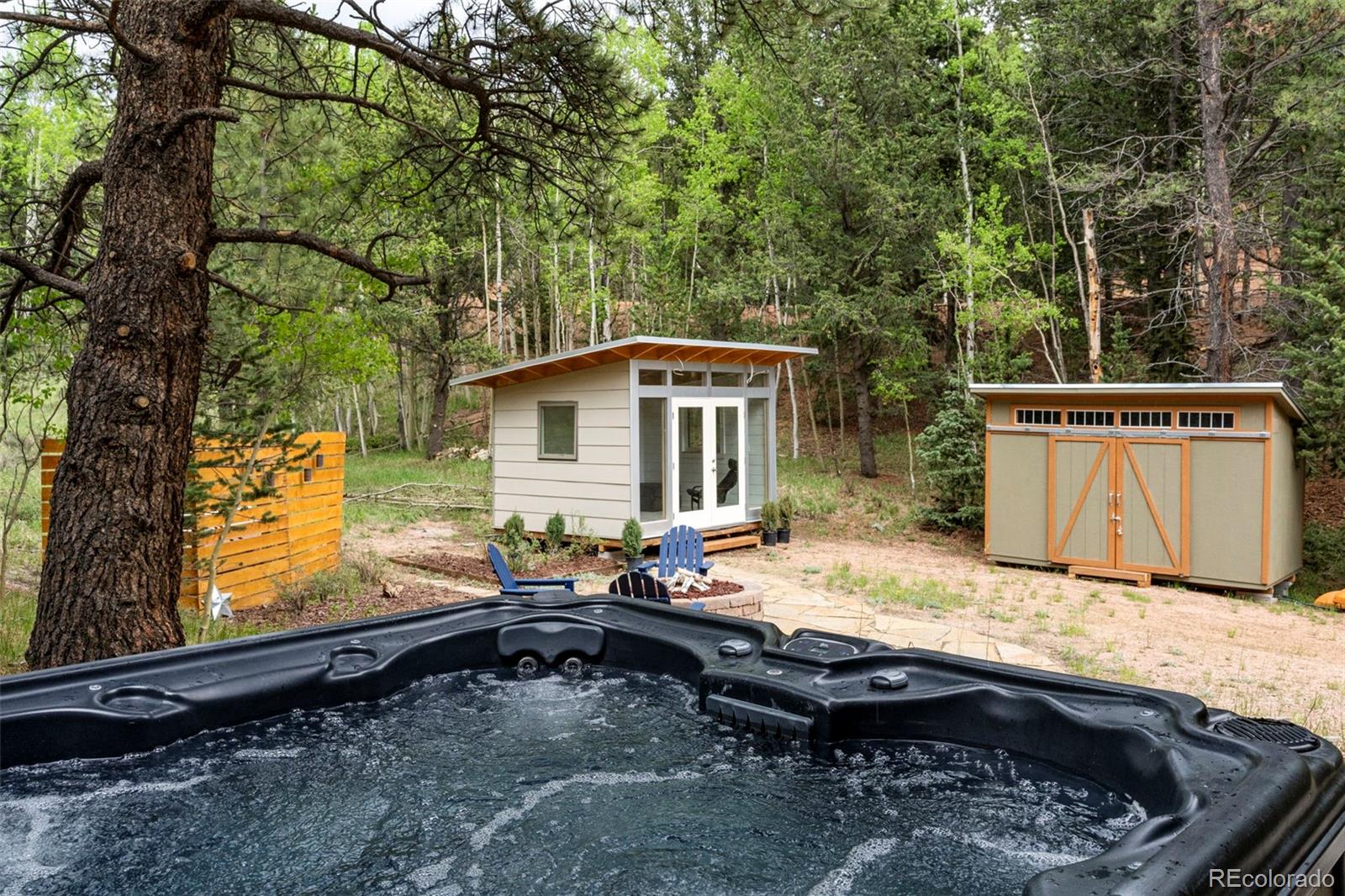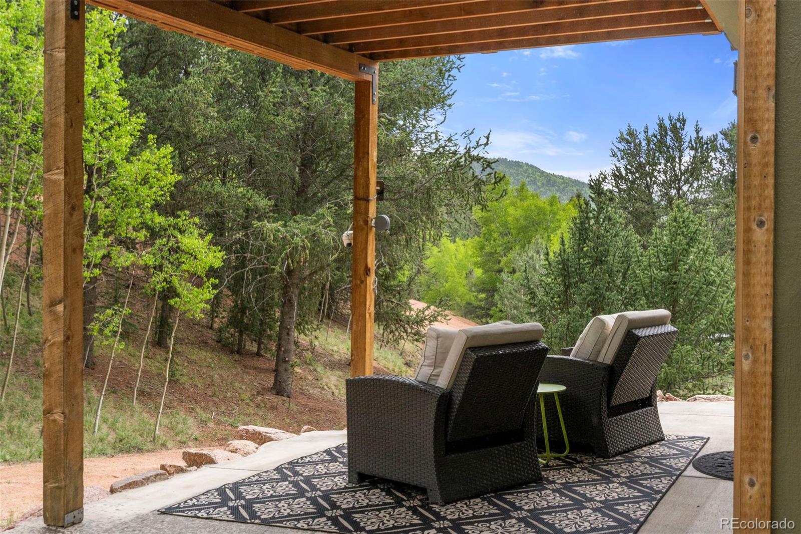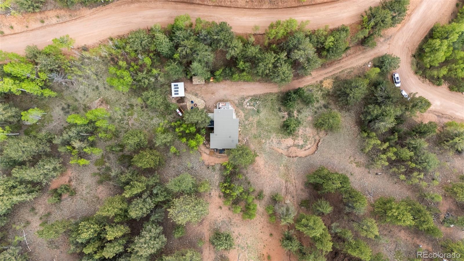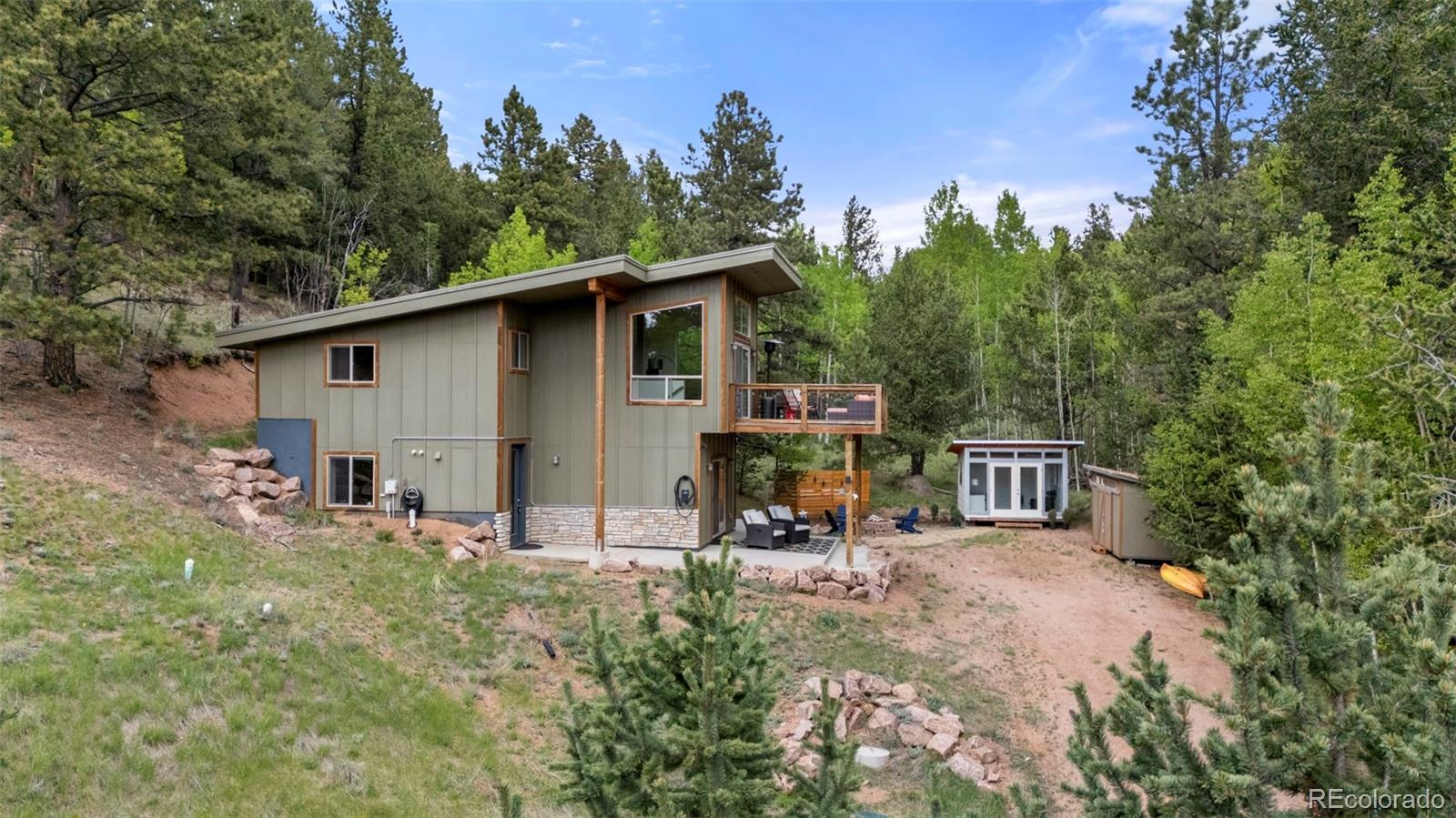 Charming modern mountain home nestled on a 1.28-acre lot with breathtaking views of the surrounding trees and mountains! This delightful raised ranch residence features 1488 square feet of living space, including 3 bedrooms and 2 bathrooms. The great room concept main floor, features soaring ceilings, a cozy gas fired stove, and many windows that bring the peace of the outdoors inside. Walk-out out to the spacious deck to take in the surrounding mountain air, sunshine, and serenity. Custom built-ins adorn the dining area and the kitchen boasts granite counter tops, hickory cabinets and stainless appliances. The master bedroom is light and bright with a generous walk-in closet and the custom bathroom, with a beautifully designed walk-in shower, completes the main level. The lower level includes 2 bedrooms, one of which features many built-in bookshelves, a full custom bathroom, and a family room with more built-ins and a pellet stove. Walk-out to the patio to enjoy outdoor living with a hot tub and fire pit. Just steps from the outdoor living area is an adorable 120 square foot, finished, studio/bunkhouse currently set up as an office. This wonderful extra space can be whatever you choose, and is solar powered and heated with a small stove. Store all of your outdoor adventure gear or tools in the roomy storage shed and an EV charging station was recently added. All furnishings are negotiable, making this sweet retreat ready to move in! Located between Divide and Cripple Creek via Highway 67 with easy access on county maintained roads. The town of Woodland Park is a short 20 minute drive for all major amenities. The recreational activities available within minutes are endless. World class skiing and white water rafting are within a 1-1/2 hour drive. This home showcases exceptional quality, with meticulous attention to every detail. Come and see for yourself!