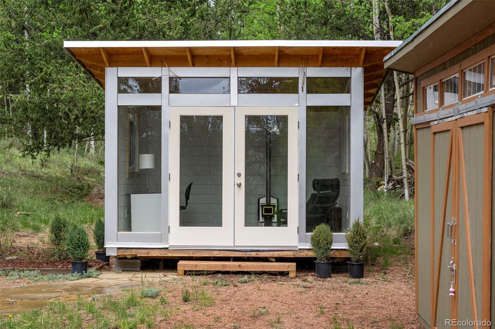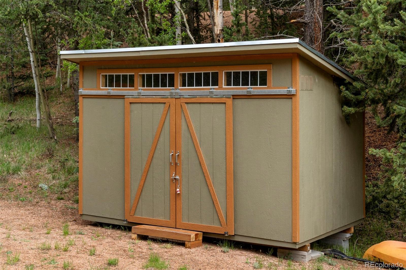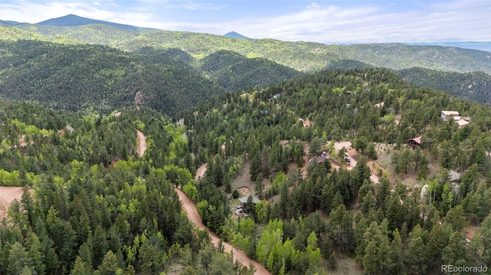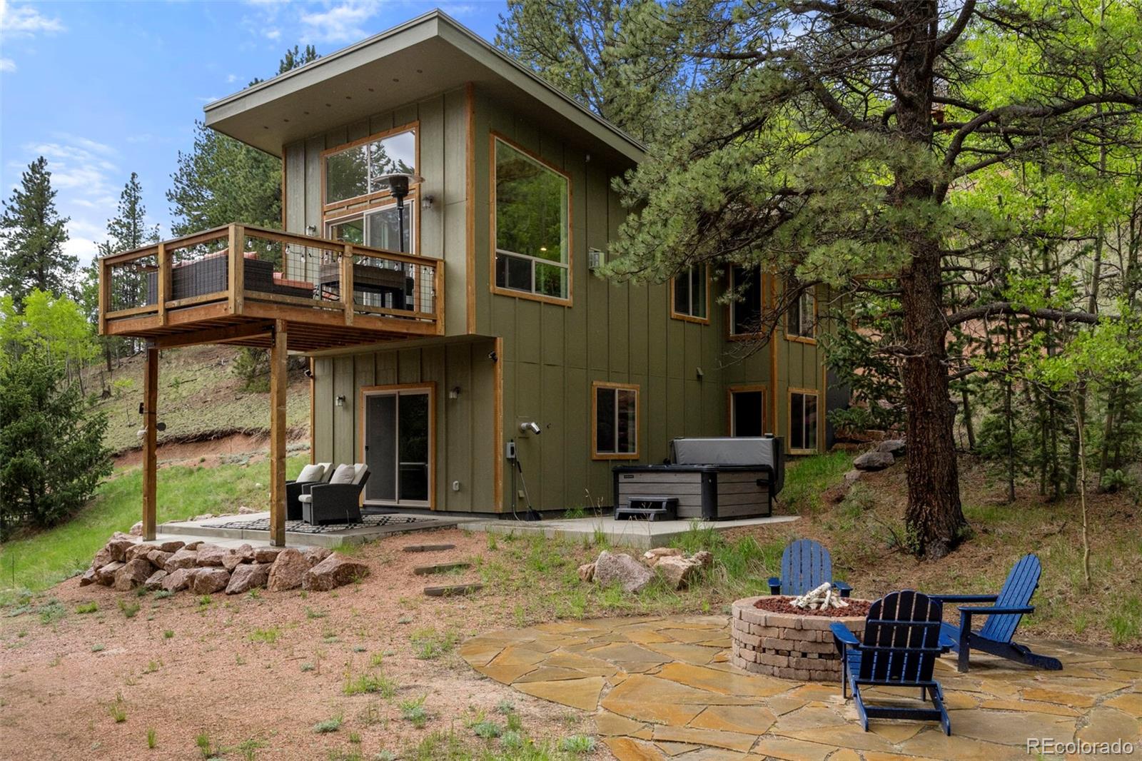 Charming modern mountain home nestled on a 1.28-acre lot with breathtaking views of the surrounding trees and mountains! This delightful raised ranch residence features 1488 square feet of living space, including 3 bedrooms and 2 bathrooms. The great room concept main floor, features soaring ceilings, a cozy gas fired stove, and many windows that bring the peace of the outdoors inside. Walk-out out to the spacious deck to take in the surrounding mountain air, sunshine, and serenity. Custom built-ins adorn the dining area and the kitchen boasts granite counter tops, hickory cabinets and stainless appliances. The master bedroom is light and bright with a generous walk-in closet and the custom bathroom, with a beautifully designed walk-in shower, completes the main level. The lower level includes 2 bedrooms, one of which features many built-in bookshelves, a full custom bathroom, and a family room with more built-ins and a pellet stove. Walk-out to the patio to enjoy outdoor living with a hot tub and fire pit. Just steps from the outdoor living area is an adorable 120 square foot, finished, studio/bunkhouse currently set up as an office. This wonderful extra space can be whatever you choose, and is solar powered and heated with a small stove. Store all of your outdoor adventure gear or tools in the roomy storage shed and an EV charging station was recently added. All furnishings are negotiable, making this sweet retreat ready to move in! Located between Divide and Cripple Creek via Highway 67 with easy access on county maintained roads. The town of Woodland Park is a short 20 minute drive for all major amenities. The recreational activities available within minutes are endless. World class skiing and white water rafting are within a 1-1/2 hour drive. This home showcases exceptional quality, with meticulous attention to every detail. Come and see for yourself!