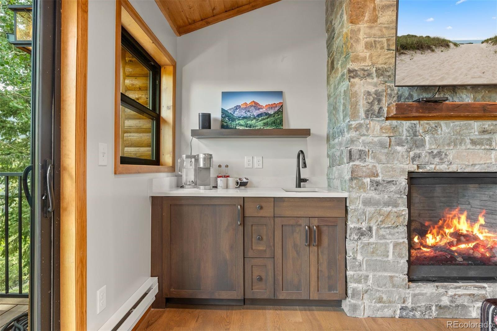 Originally built in 1988, the home has been meticulously updated to preserve its original character while introducing thoughtful modern touches. A stunning addition completed in 2022 creates a luxurious primary suite sanctuary, complete with vaulted ceilings, a private deck with panoramic views, a large walk-in closet with exceptional storage, and a spa-inspired bathroom featuring crisp finishes, a herringbone brick floor, and a generous walk-in shower. The suite is truly a retreat, featuring its own floor-to-ceiling stone fireplace and a built-in coffee bar for cozy mornings and relaxing evenings.