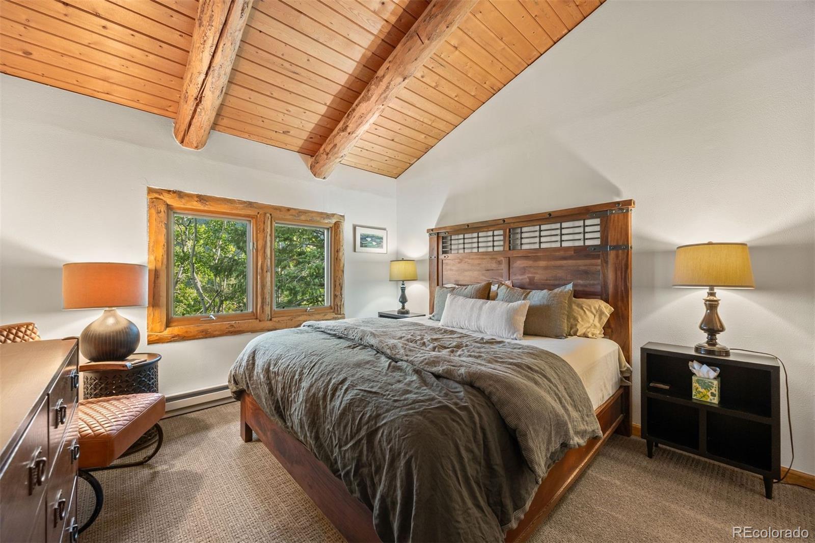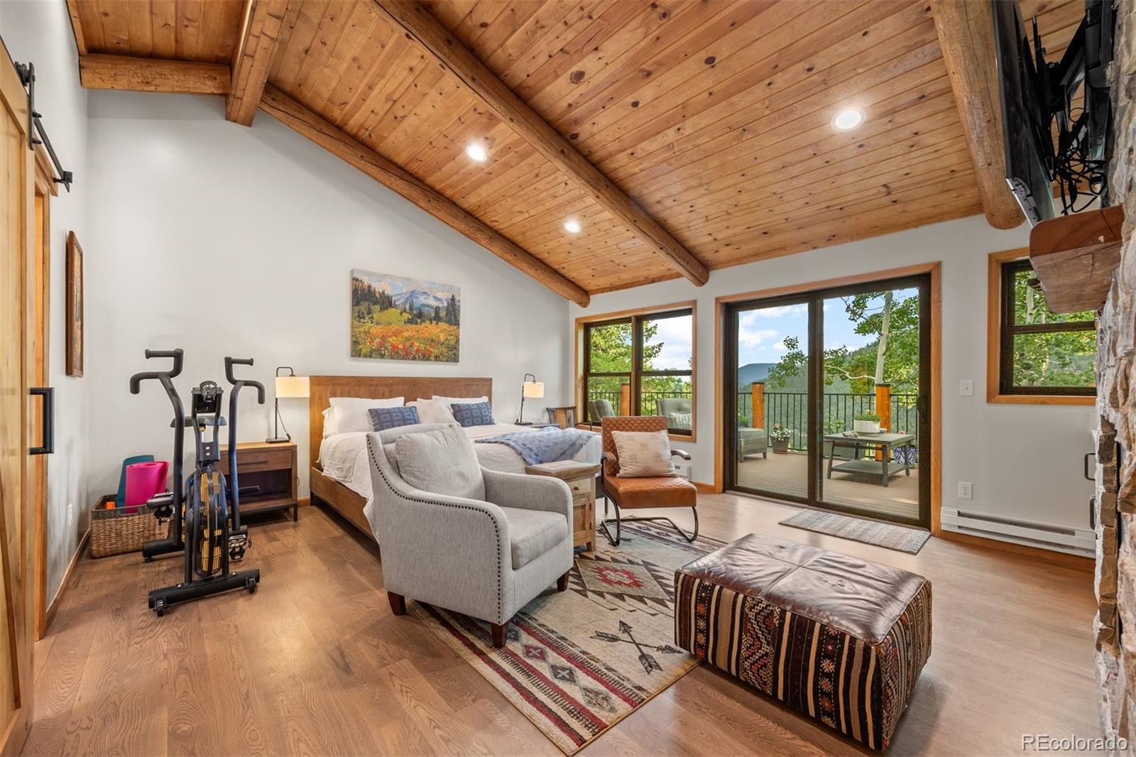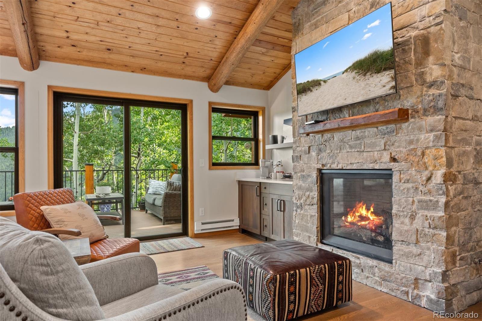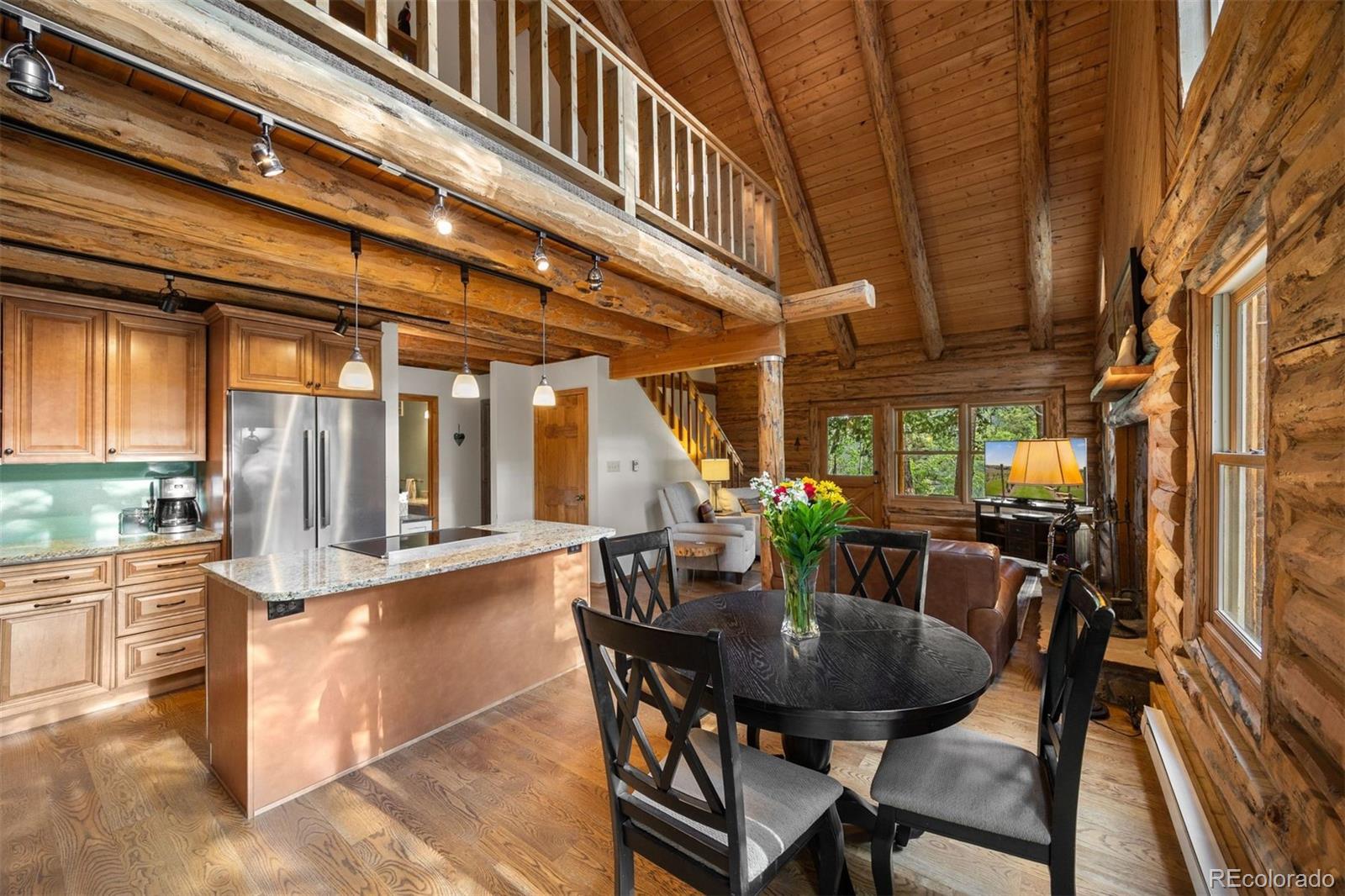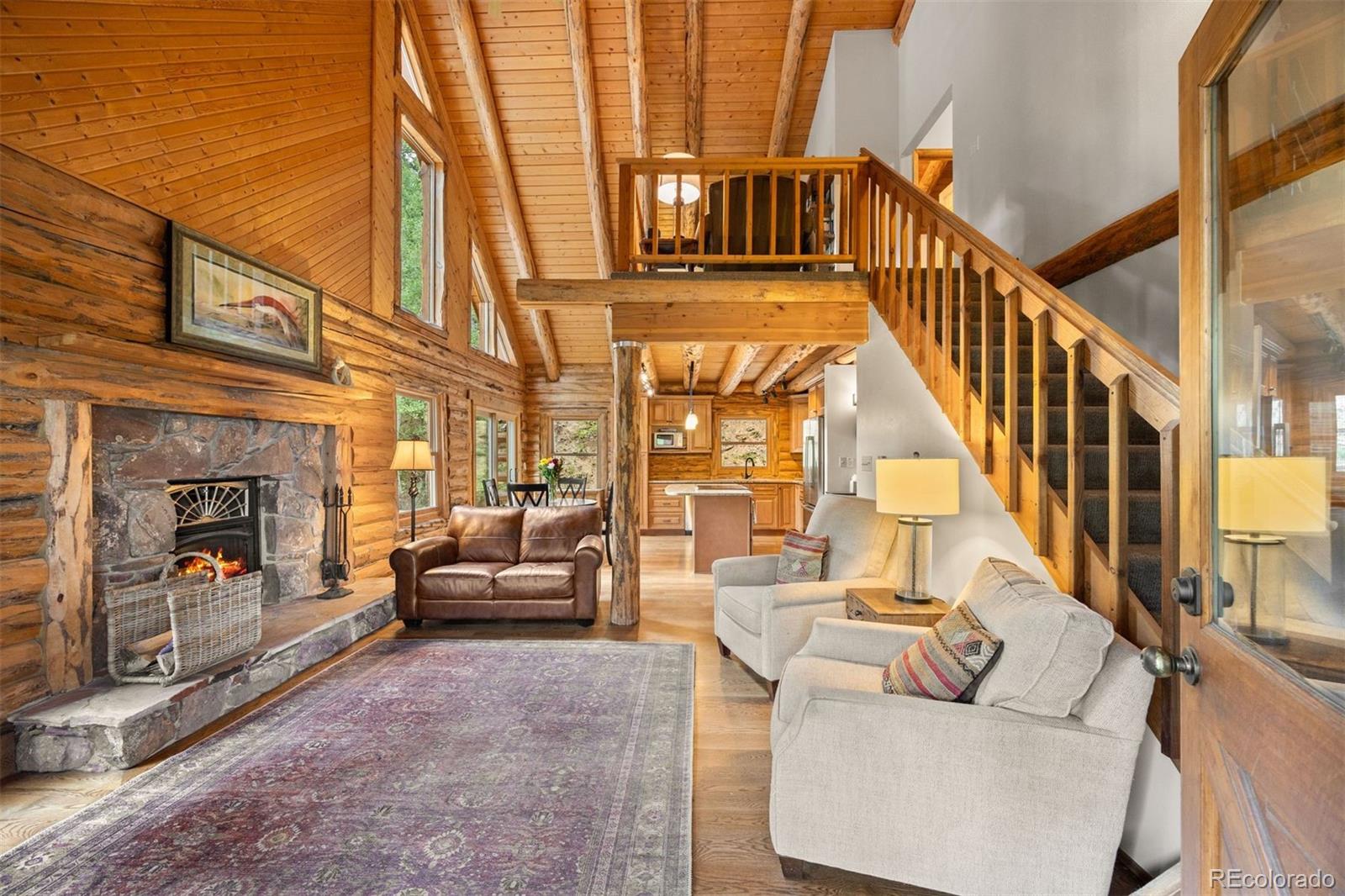 The heart of the home is a warm and inviting two-story great room with soaring ceilings, wood beams, and a woodburning fireplace. The great room flows seamlessly into the kitchen and dining area, creating an open-concept space ideal for gathering and entertaining. From here, step directly onto expansive decks that invite you to enjoy fresh Colorado air, sunshine, and peaceful views.